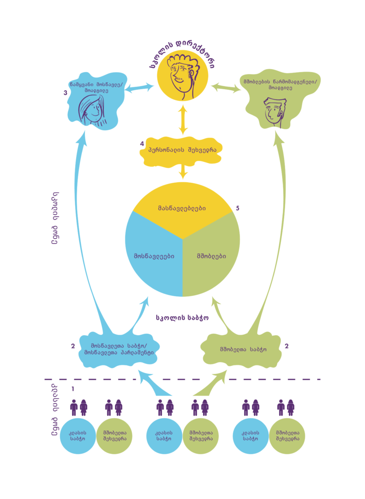 (# 2) ქვეყნების უმრავლესობაში, სასწავლო პროგრამაში ან კანონმდებლობაში მოცემულია დებულებები, რომლებიც მოსწავლეთა მონაწილეობის უფლებებს ეხება. აქ მოყვანილ მაგალითში, როგორც მოსწავლეები, ასევე მათი მშობლები, ირჩევენ წარმომადგენლებს, რომლებიც მათი სახელით მოქმედებენ სკოლის ფარგლებში. ამგვარი ორგანიზება ერთდროულად დემოკრატიულიც არის და ეფექტიანიც, ვინაიდან სკოლის მართვაში მონაწილეობა მოითხოვს დროსა და გამოცდილებას. როგორც სკოლის ხელმძღვანელი, თქვენ მნიშვნელოვან როლს ასრულებთ სკოლის ფარგლებში მოსწავლეებისა და მათი მშობლების ჩართულობისა და მონაწილეობის უზრუნველყოფაში, მათი გამხნევებითა და მხარდაჭერით (იხ. სკოლების დემოკრატიული მმართველობა, ევროპის საბჭოს პუბლიკაცია, 2007 წ., გვ. 37; ).