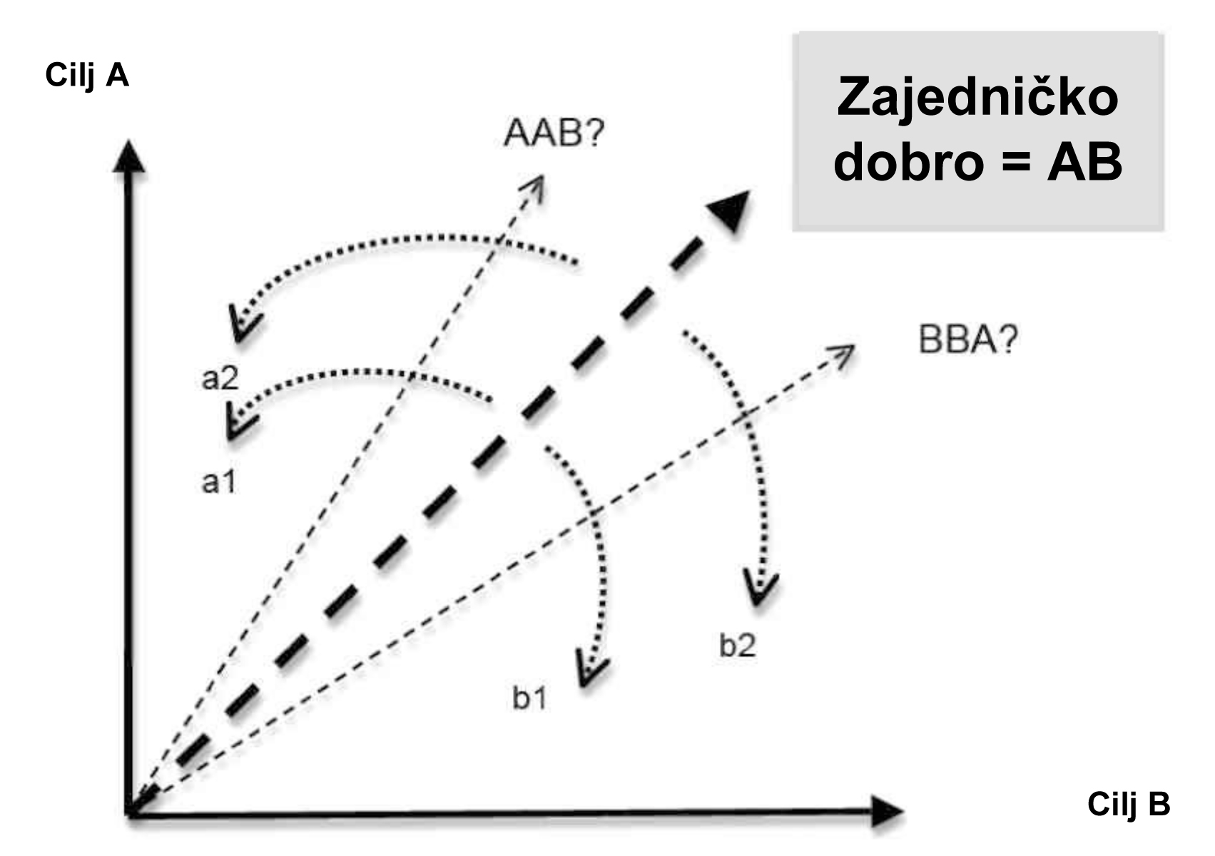 Stranke stoga pokušavaju utjecati na donošenje odluka u njihovom smjeru – a1 i a2 u prilog cilju AAB, s time da stranke b1 i b2 vuku u suprotnom smjeru (BBA).