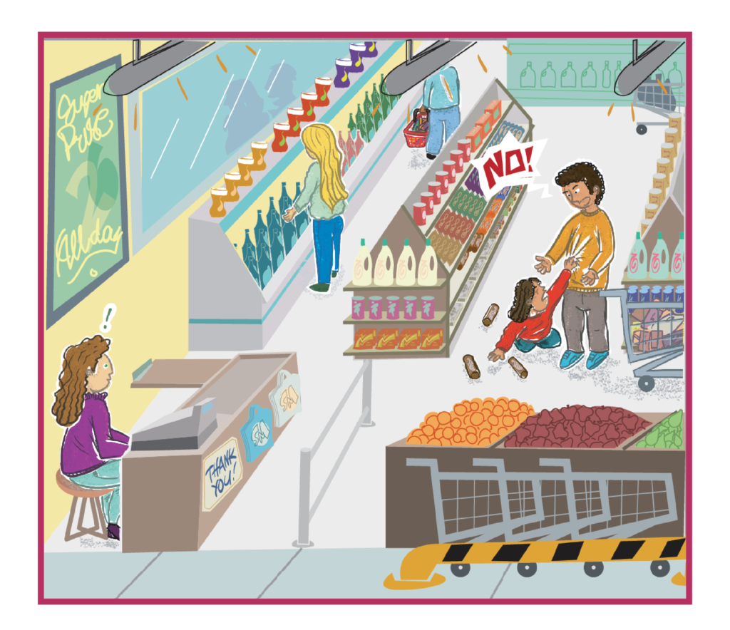 Otišli ste u kupovinu sa 2-godišnjom kćerkom Celinom koja vidi puno zanimljivih stvari poput čokolade, plastičnih zdjela i časopisa. Želi da te stvari stavite u košaricu i kupite. Ali ovi proizvodi vam ne trebaju i govorite joj da ih ostavi. Celina tada želi da kupite tri kutije njenih omiljenih kolačića. Vi joj govorite: „Ne, Celina, te kolačiće već imaš kod kuće. Molim te, vrati ih na policu!” Ali Celina ne sluša i insistira da joj kupite ove kolačiće. Zatim se počinje derati, i čini se da se neće uskoro smiriti.