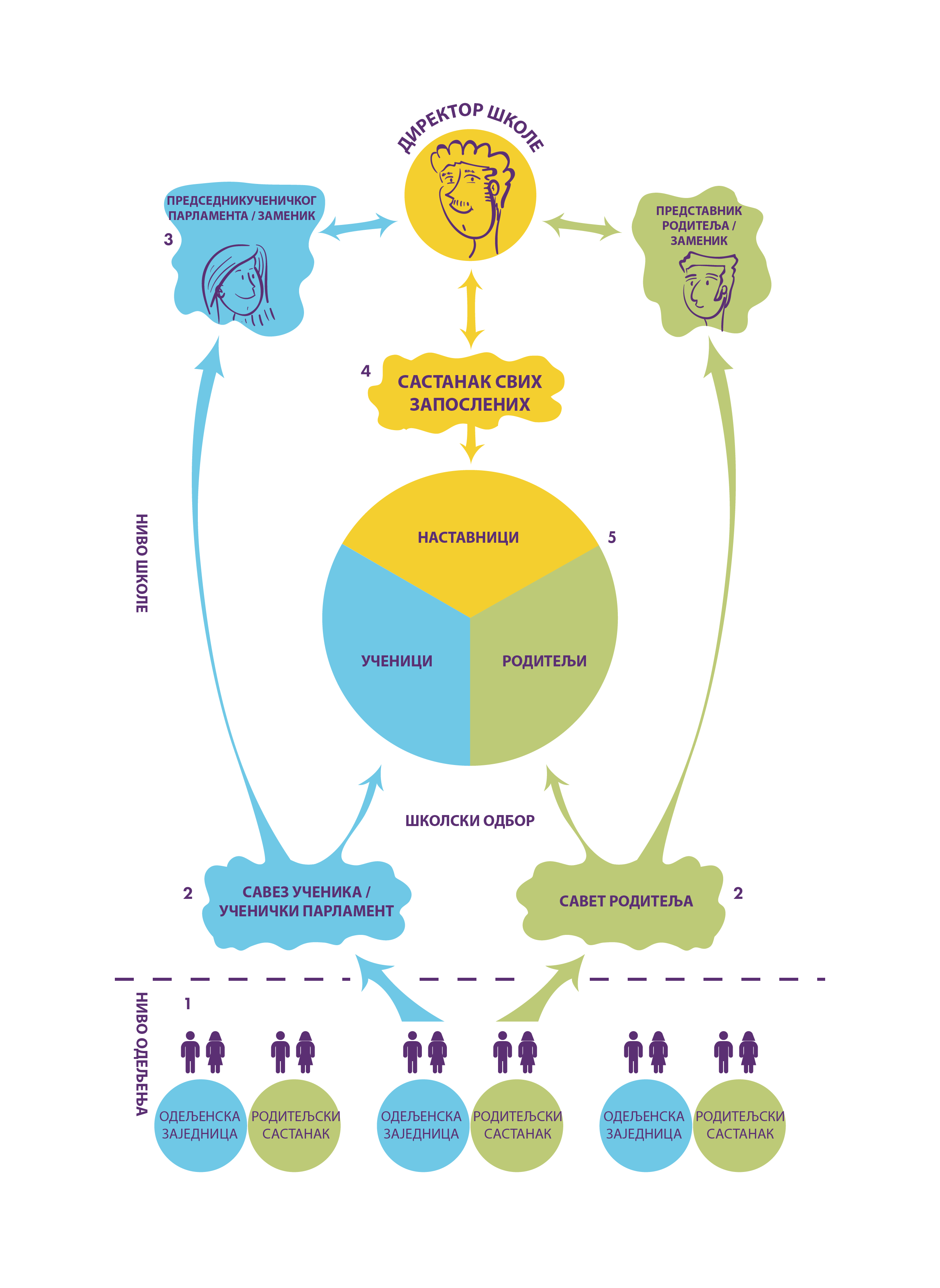 (Br. 5) U mnogim zemljama, zakonskim propisima obavezno je da postoji školsko vijeće ili školski odbor. U primjeru koji je ovdje prikazan, učenici, roditelji i nastavnici biraju predstavnike koji će sjediti u školskom vijeću/odboru. Glavni predstavnici učenika i roditelja pripadaju tom vijeću/odboru prema njihovoj funkciji. Ovo upravljačko školsko tijelo razlikuje se od zemlje do zemlje. Može uključivati predstavnike lokalne zajednice pored učenika ili umjesto njih. Članovi mogu biti privremeno izabrani, umjesto dugoročno. Školsko vijeće/odbor se sastaje najmanje dva puta u školskoj godini. U našem primjeru, školsko vijeće/odbor, kojim predsjedava direktor škole, odlučuje o važnim pitanjima, poput odobravanja pravila škole ili školskog programa. Takođe može procijeniti kandidate za položaj novog direktora ili zamjenika direktora škole i odobriti budžet škole. Odluke školskog vijeća/odbora obavezujuće su za osoblje i direktora. Ako se direktor škole ne slaže s odlukom, školsko vijeće/odbor donosi odluku. Sastanci nisu otvoreni za javnost, a dnevni red i
