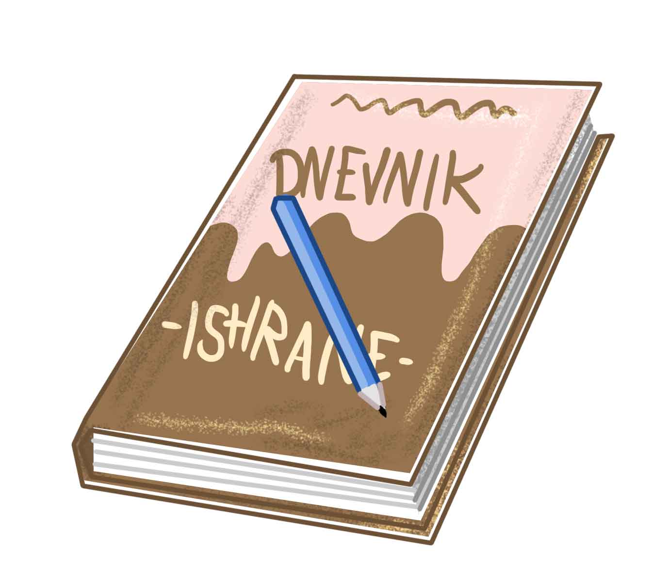 | Vrijeme početak – kraj | Obrok ili užina | Mjesto | Hrana | Iznos | Držanje | Povezana aktivnost | Socijalno stanje | Raspoloženje | Nivo gladi |