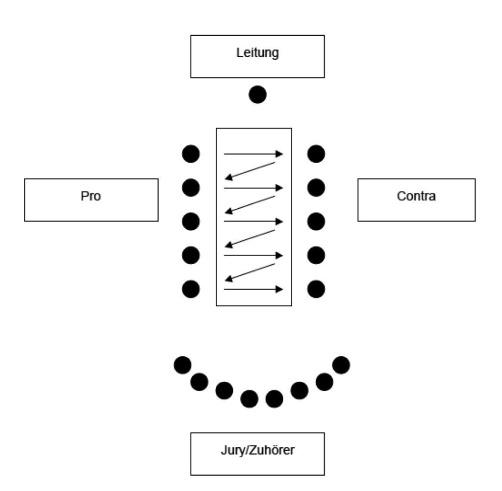 Sechs Tische werden in der Mitte des Klassenraums zusammengerückt. Ein/e Schüler/in übernimmt die Leitung der Debatte und nimmt am Kopfende Platz (siehe Grafik). An der gegenüberliegenden Seite sind die Sitzreihen für die Beobachterteams und die Zuhörenden angeordnet. Sie halten etwa zwei Meter Abstand zum Debattentisch. Die beiden Debattenteams sitzen sich an den Längsseiten gegenüber.