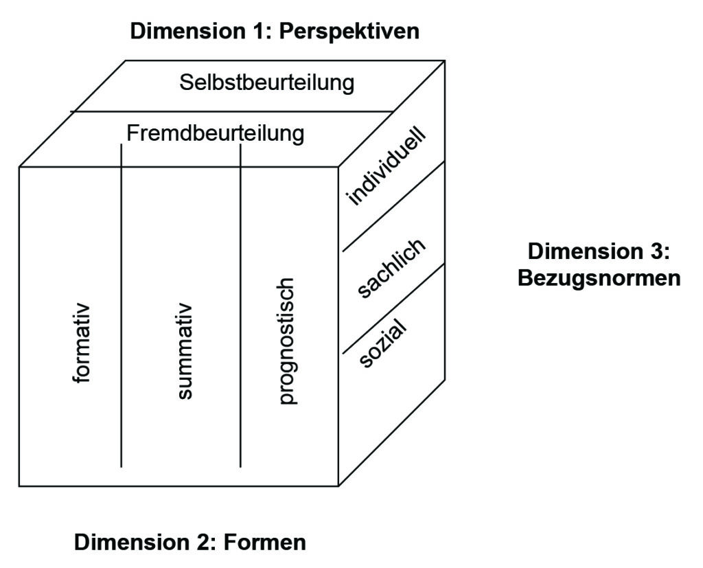 Dimension 1 – Perspektiven: Die Lernenden können sich selbst beurteilen (Selbstbeurteilung) oder von anderen beurteilt werden (Fremdbeurteilung).