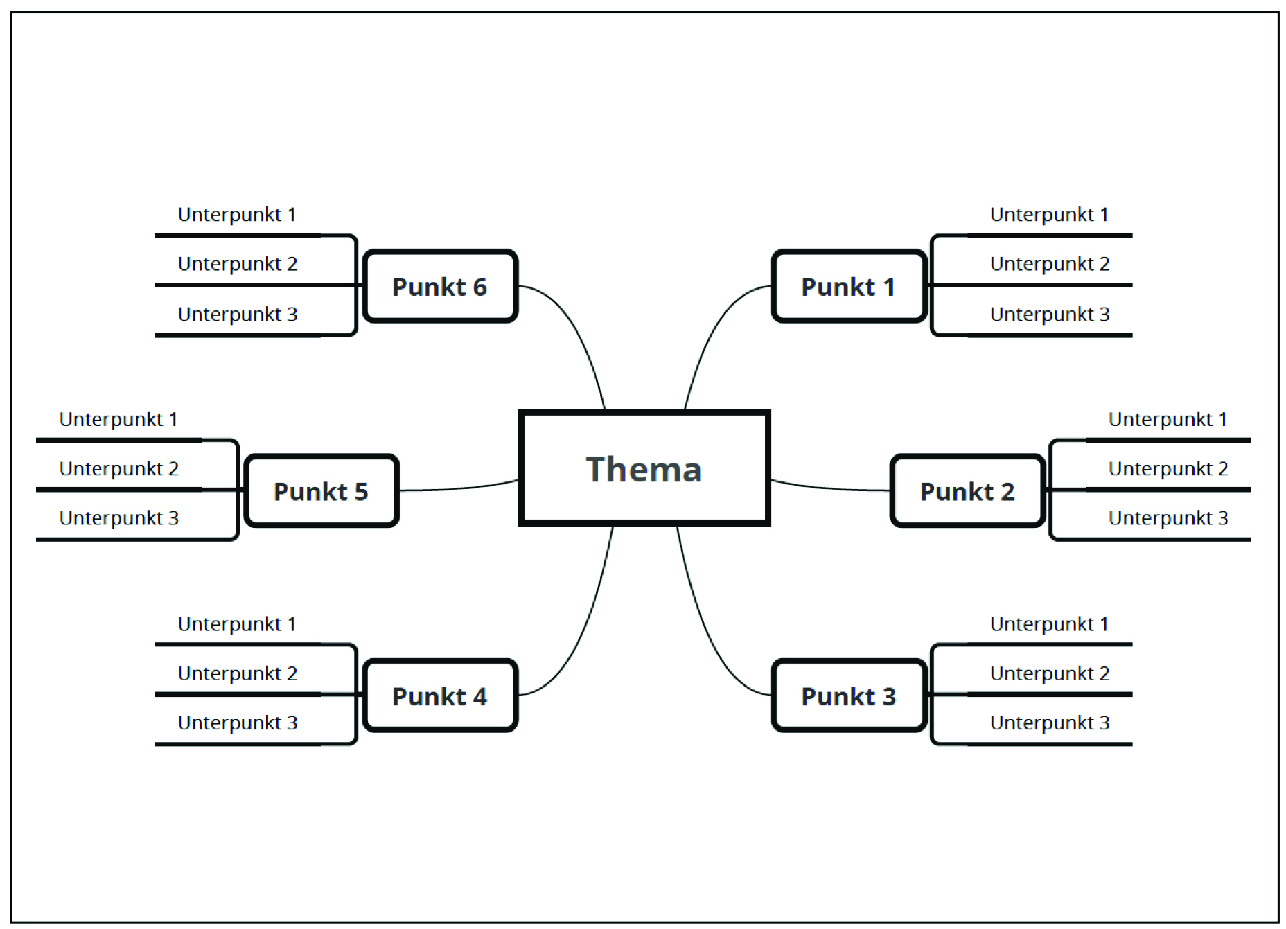 Eine Mindmap (wörtlich: „Gedankenlandkarte“) hilft Dir, deine Gedanken zu sortieren und miteinander zu verbinden. Mindmaps können in vielen verschiedenen Situationen nützlich sein, in denen du dir zu einem bestimmten Thema Gedanken machen musst, wenn du Ideen sammelst (Brainstorming), eine Präsentation vorbereitest, ein Projekt planst usw.