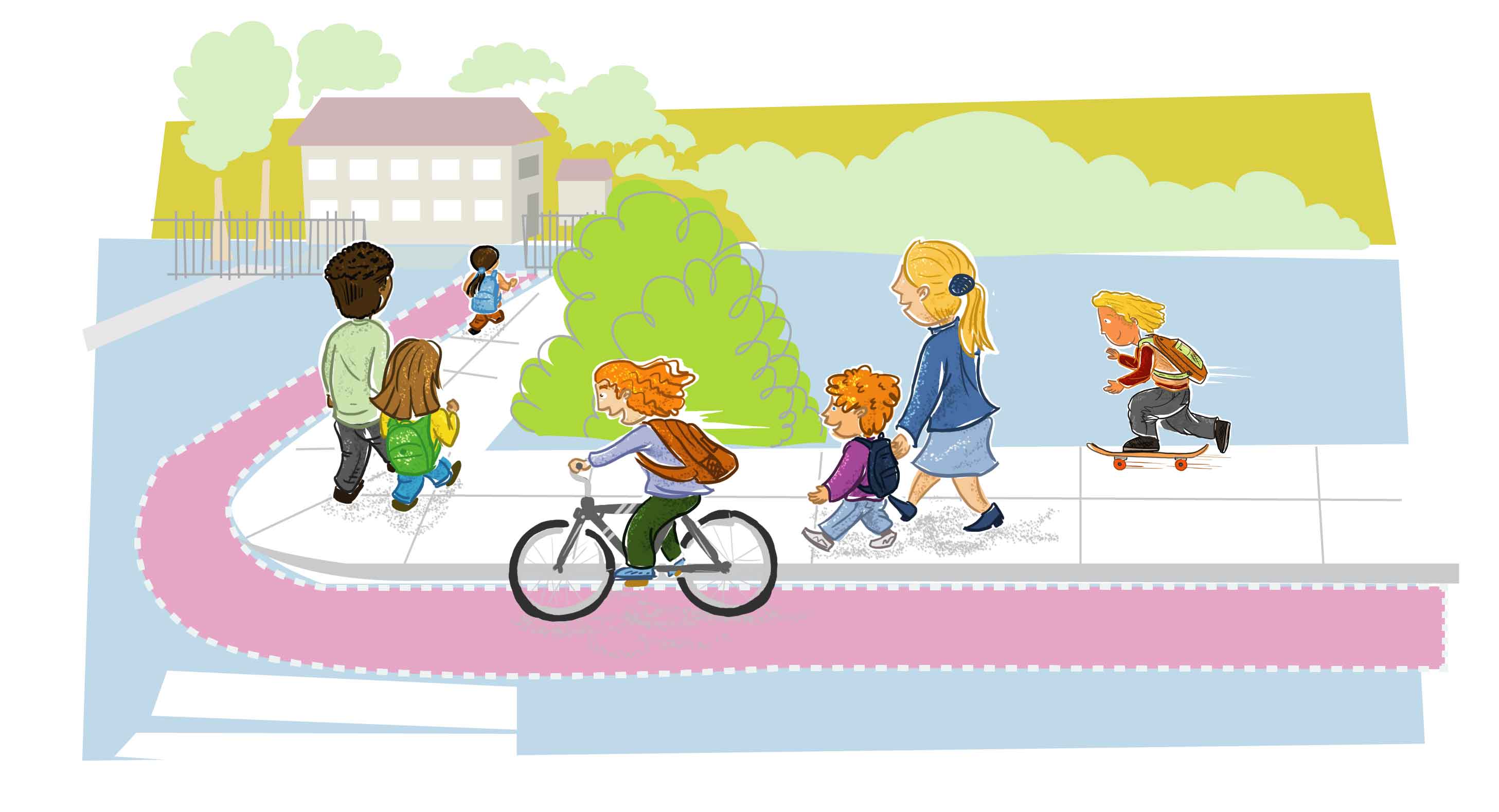 Οι μαθητές και οι οικογένειές τους παροτρύνονται να συναντηθούν σε ένα κοντινό πάρκο της γειτονιάς για να συμμετάσχουν σε μία βόλτα με τα ποδήλατα μέχρι το σχολείο. Παίρνει μέρος και ο διευθυντής, καθώς και διάφοροι επίσημοι και ένας τοπικός αθλητής. Πριν ξεκινήσουν, ελέγχουν τα κράνη ότι εφαρμόζουν σωστά και μοιράζουν επιπλέον κράνη στους μαθητές που δεν έχουν. Η ομάδα ξεκινάει τότε τη βόλτα για το σχολείο, όπου οι εκπαιδευτικοί τους υποδέχονται και μοιράζουν μπλουζάκια και ανακλαστικό εξοπλισμό ασφαλείας για το ποδήλατο.