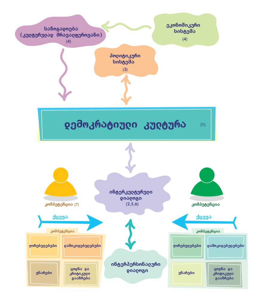 Living Democracy » Principals » სწავლა » მზადება » დემოკრატიული კულტურის კომპეტენციები: დიაგრამაწყარო: იხ დემოკრატიული კულტურის კომპეტენციები სურათზე რიცხვებით 1 – 7 აღნიშნული ელემენტების განმარტებები იხილეთ შესაბამისად დანომრილ კომენტარებშე.