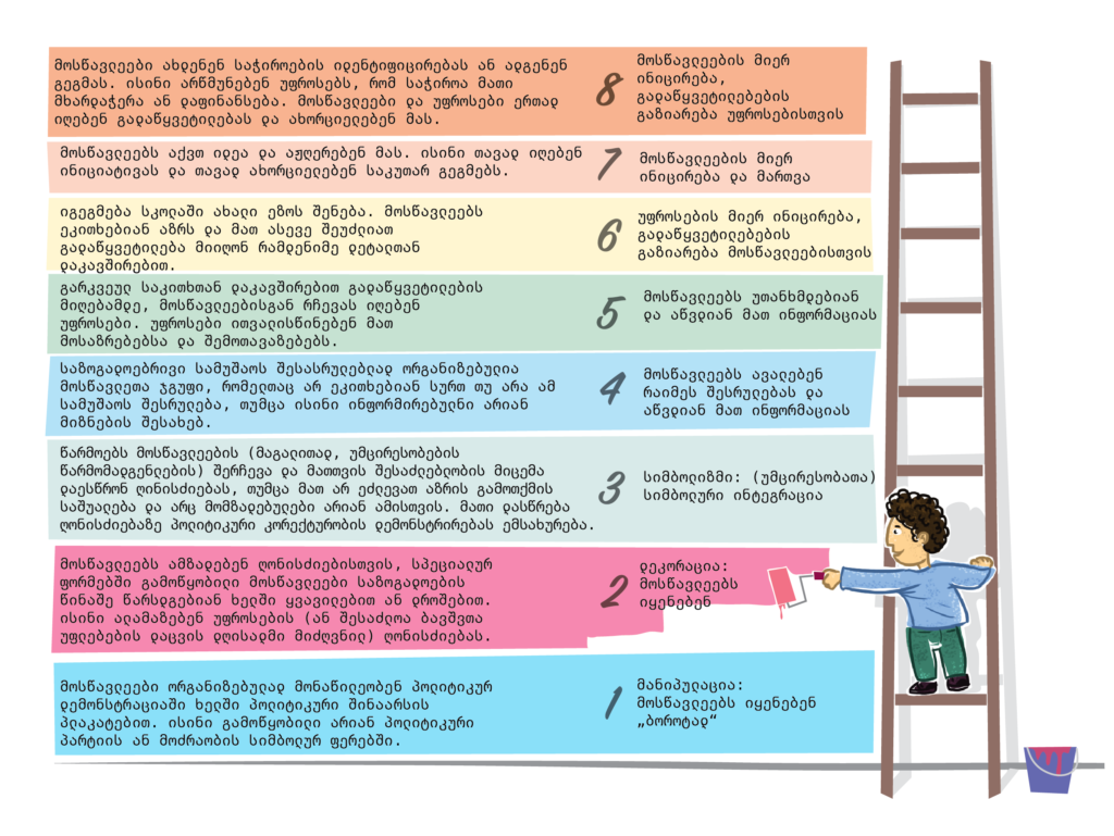 Living Democracy » Principals » მონაწილეობა » ინფორმირებულობა » მონაწილეობის კიბე: ეცადე იყო გულახდილი!სოციოლოგი როჯერ ჰარტი არის ავტორი ნაშრომისა, სახელწოდებით „ბავშვთა მონაწილეობა: ახალგაზრდა მოქალაქეების ჩართვა საზოგადოების განვითარებისა და გარემოს დაცვის ინიციატივაში, გაეროს ბავშვთა ფონდი (UNICEF) 1997 წ. – თეორია და პრაქტიკა“. ამ ნაშრომში აღწერილი მიდგომა იქცა მსოფლიოში ახალგაზრდებისა და მათ მოკავშირეთა გლობალური მოძრაობის სტიმულად, რომელიც ახალგაზრდების ჩართულობისა და მონაწილეობის ხელშეწყობას ემსახურება. იგი თქვენ, მასწავლებლებსა და მოსწავლეთა მშობლებს, უნიკალურ შესაძლებლობას გთავაზობთ: ნათლად დაინახოთ რამდენად უწყობთ ხელს გადაწყვეტილებების მიღების პროცესებში ბავშვებისა და ახალგაზრდების მონაწილეობასა და ჩართულობას. აღმოჩნდა რომ, ძალიან ხშირად, ბავშვებს, სცენაზე, ღონისძიების ფარგლებში გამართული შეხვედრებისას, თუ თეატრალურ წარმოდგენებში, დეკორაციების სახით ვიყენებთ, ან, მაქსიმუმ, ამ უმცირესობათა ჩართვა პროცესებში სიმბოლურად წარმოებს, სინდისის დასამშვიდებლად. (http://www.freechild.org/ladder.htm)