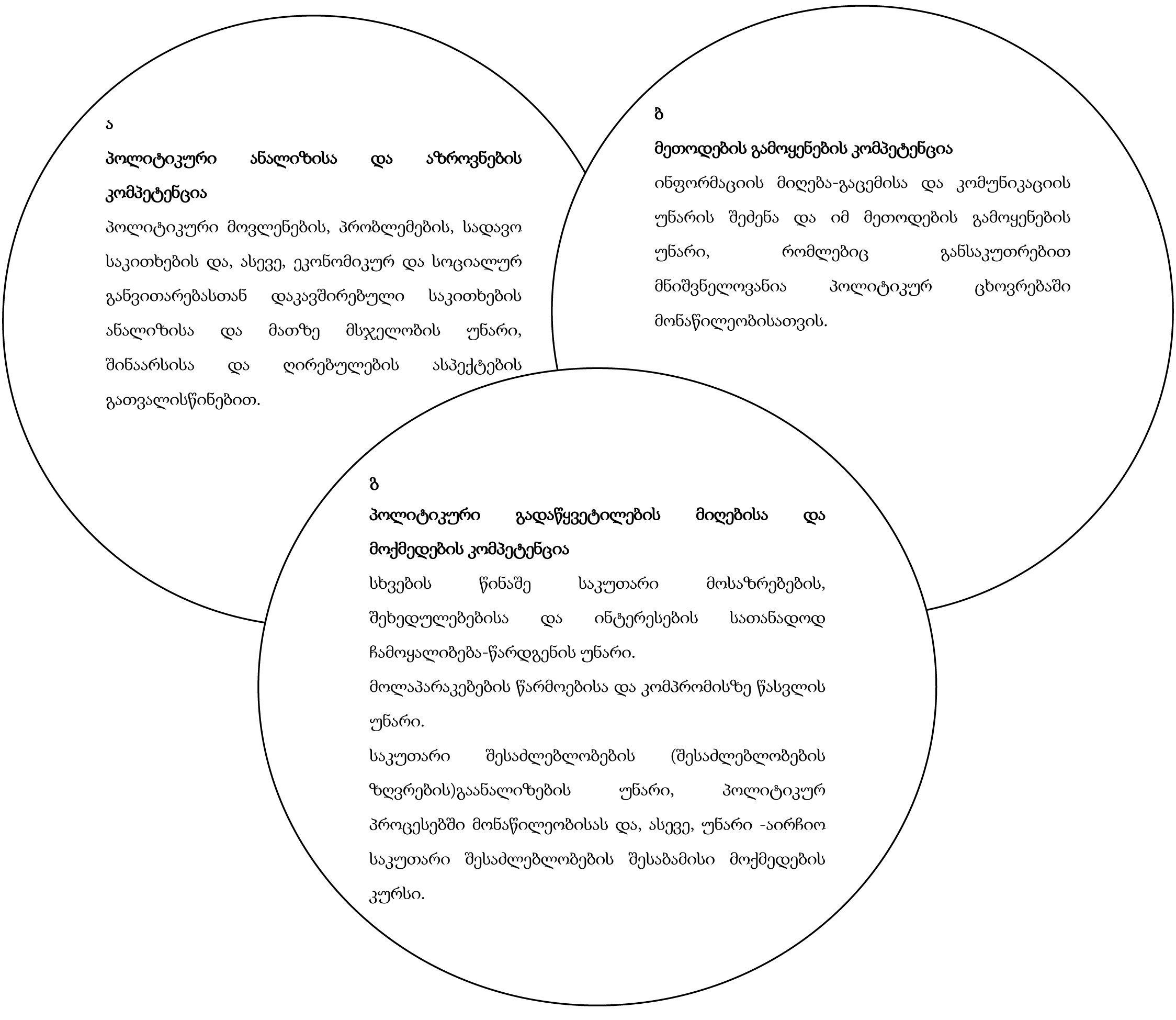 - საზოგადოებრივ ცხოვრებაში მონაწილეობა და პოლიტიკური მოქმედების უნარი (ზეპირი მეტყველების უნარები, როგორიცაა საკუთარი შეხედულების ახსნა-განმარტება, მსჯელობა, დებატებში მონაწილეობა, დისკუსიაში წამყვანი როლის ამ მომრიგებლის როლის შესრულება; წერილობითი პრეზენტაციისა და ვიზუალიზაციის ტექნიკის ფლობა: პოსტერების, კედლის გაზეთების, შეხვედრათა ოქმების, ჟურნალ-გაზეთების რედაქტორებისათვის განკუთვნილი წერილების და ა.შ. შედგენა);