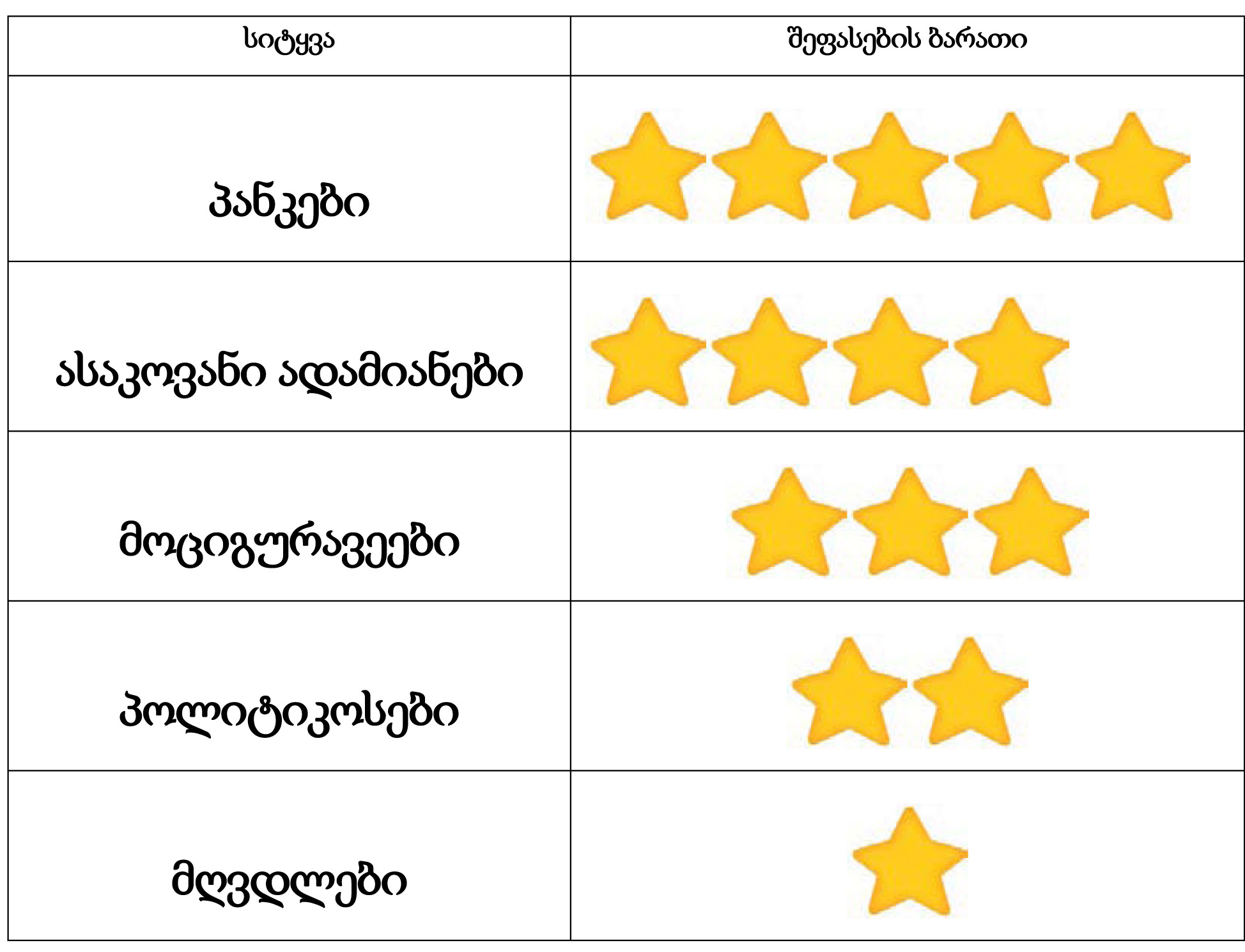 Living Democracy » Textbooks » ვიზრდებით დემოკრატიულ საზოგადოებაში » სახელმძღვანელო მოსწავლეებისათვის » I. სამუშაო ფურცლები მოსწავლეებისათვის (ნაკრები) – შესავალი » სამუშაო ფურცელი მოსწავლეებისათვის, თავი 3, გაკვეთილი 4: ბარათები სიტყვებითა და შეფასების სიმბოლოებით