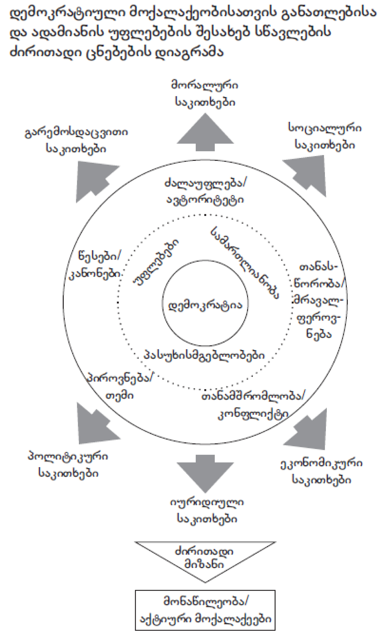 დემოკრატია დიაგრამის ცენტრშია და მიანიშნებს იმაზე, რომ ეს ცნება დემოკრატიული მოქალაქეობისა და ადამიანის უფლებათა შესახებ სწავლების ყველა კონტექსტში გვხვდება. აქტიური მოქალაქეების დემოკრატიულ პროცესებში მონაწილეობა დემოკრატიული მოქალაქეობისათვის განათლებისა და ადამიანის უფლებების შესახებ სწავლების ძირითადი მიზანია; ეს ცნებებიც ნათლადაა გამოყოფილი.
