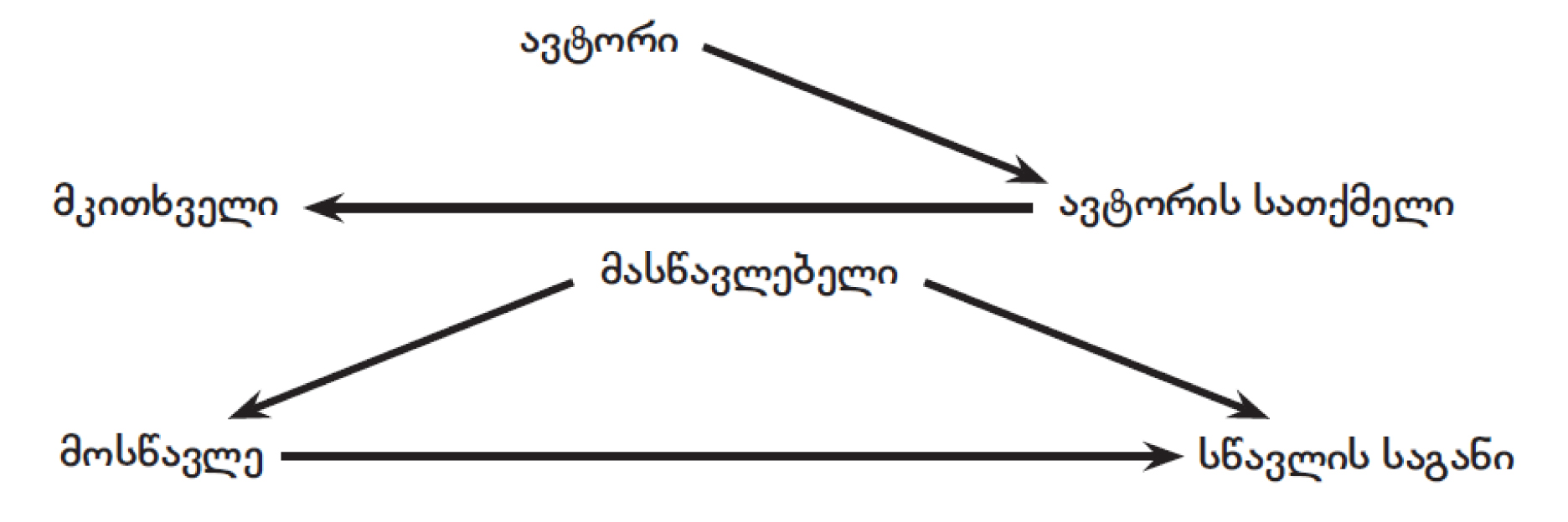 ავტორის, მკითხველისა და ავტორის სათქმელის ურთიერთქმედება სამკუთხედით შეიძლება გამოვსახოთ. ეს იმას ნიშნავს, რომ ავტორი სრულად ვერ აკონტროლებს იმას, თუ როგორ აღიქვამს მის სათქმელს მკითხველი. ანალოგიურად, მასწავლებელს არ შეუძლია, წინასწარ განსაზღვროს ახსნილი მასალიდან რას დაიმახსოვრებს, ან დაივიწყებს მოსწავლე.