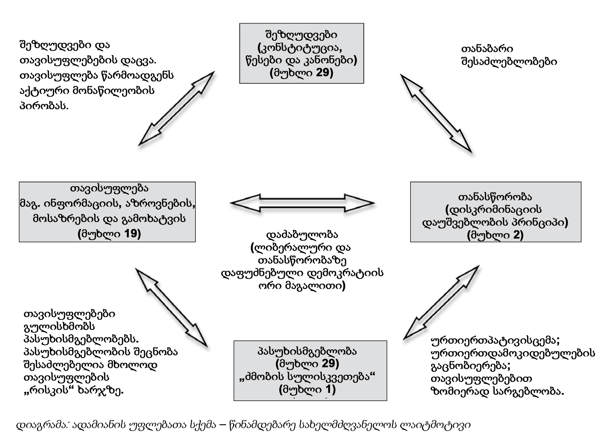 | 7 თანასწორობა | დემოკრატიის კულტურული განზომილების აღიარება | უმრავლესობისა და უმცირესობის უფლებათა დარეგულირება | ურთიერთაღიარება | |