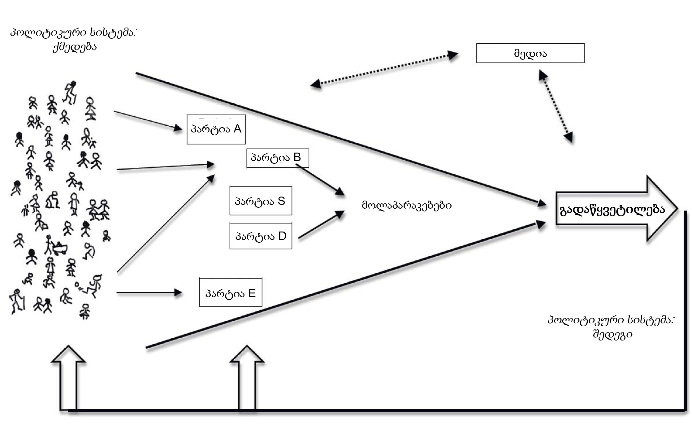 | პირები საუბრობენ თავიანთ განსხვავებულ ინტერესებასა და მიზნებზე | ინტერესთა გაერთიანება წარმომადგენლობითი წესით (პარტიები, ლობისტთა ჯგუფები ან არასამთავრობო ორგანიზაციები) ან პირდაპირი წესით (რეფერენდუმი) | შედეგი არის პოლიტიკური გადა–წყვეტილება, რომელიც საზოგადოე–ბაზე ახდენს გავლენას. საზოგადოების რეაგირება სათავეს უდებს ახალ შედეგებს. |