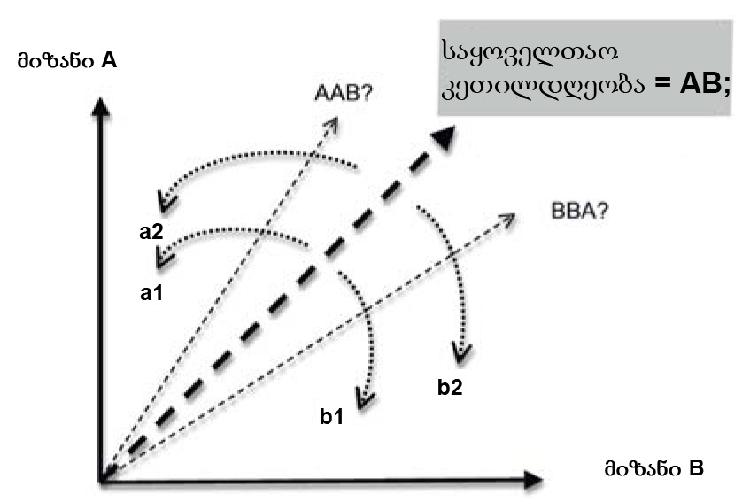 | პლურალისტულ, დემოკრატიულ საზოგადოებაში, ადანიანთა ჯგუფებს წინა პლანზე გამოაქვთ თავიანთი განსხვავებული მიზნები, ინტერესები და ფასეულობები (მიზნები A და B). ყოველი ჯგუფი ცდილობს მიაღწიოს საკუთარ მიზანს (a1, a2, b1, b2), რომ საბოლოო გადწყვეტილება მათ სასარგებლოდ იქნეს მიღებული (AAB? – BBA?). პლურალიზმი შობს კონკურენციასა და დაპირისპირებას. თავისუფალი მედია ხელს უწყობს ცოცხალ დებატებს. | დიქტატურის პირობებში, ჯგუფები ან ინდივიდები, რომლებიც ალტერნატივას წამოაყენებენ ან კრიტიკულ მოსაზრებას გამოთქვამენ ჩახშობილ არიან (X-სიმბოლო). მონაწილეობის უფლება მხოლოდ რეჟიმის მომხრეთა პრეროგატივაა. მედია მკაცრი ცენზურის ქვეშ არის. მმართველი წყვეტს თუ რომელი პრობლემა, ინტერესი თუ მიზანი დააყენოს პოლიტიკურ დღის წესრიგში. |