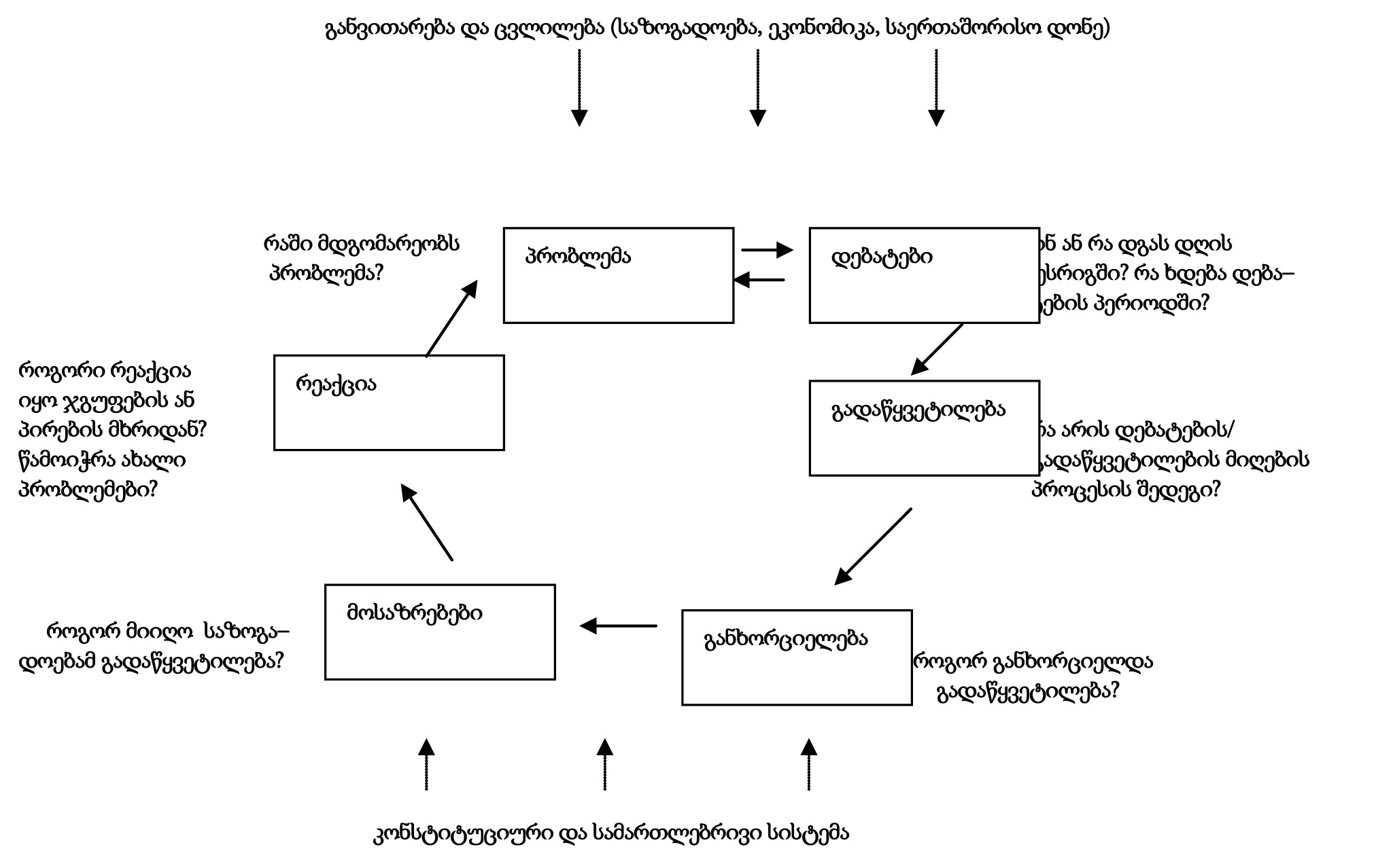 დებატები გარკვეულ პირობებში მიმდინარეობს. მოცემულ ეტაპზე მოდელის ჩარჩოს ენიჭება მნიშვნელობა: სოციალურ, ეკონომიკურ და საერთაშორისო დონეზე განვითარებული მოვლენები იძლევა მონაცემებს; ხოლო კონსტიტუციური და სამართლებრივი ჩარჩოები განსაზღვრავს წესებს. ვის შეუძლია მონაწილეობა მიიღოს დებატებში? ვინ რა გადაწყვეტილებას იღებს? ეს კითხვები გვეხმარება, განვსაზღვროთ დებატების შედეგები, საბოლოო გადაწყვეტილება. ვინ მიიღო მონაწილეობა დებატებში? ვის ინტერესებს მოიცავდა განსახილველი საკითხი? რაზე უნდა შემდგარიყო მოლაპარაკება? შესაძლებელი იყო კომპრომისის გამოძებნა?
