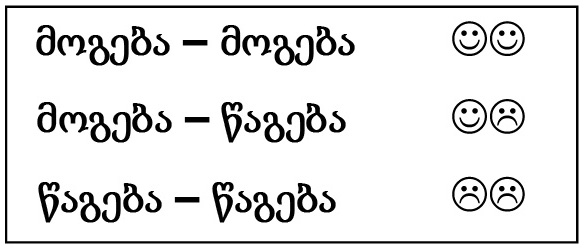 Living Democracy » Textbooks » დემოკრატიის სწავლება » თავი 8 – კონფლიქტის მოგვარება » სავარჯიშო 8.1. – მოგება-მოგება პრინციპი| საგანმანათლებლო მიზანი | მოსწავლეები აცნობიერებენ, რომ კონფლიქტის მოგვარება შესაძლებელია სხვადასხვა გზით. კონფლიქტში მონაწილე მხარეები შესაძლებელია მოგებულის და წაგებულის პოზიციაში აღმოჩნდნენ, ან შეიძლება მათ შორის შედგეს შეთანხმება კომპრომისზე. იმ შემთხვევაში, თუ გვინდა, რომ არ წარმოიშვას ახალი კონფლიქტი, არც ერთი მახარე არ უნდა აღმოჩნდეს წაგებული. |
