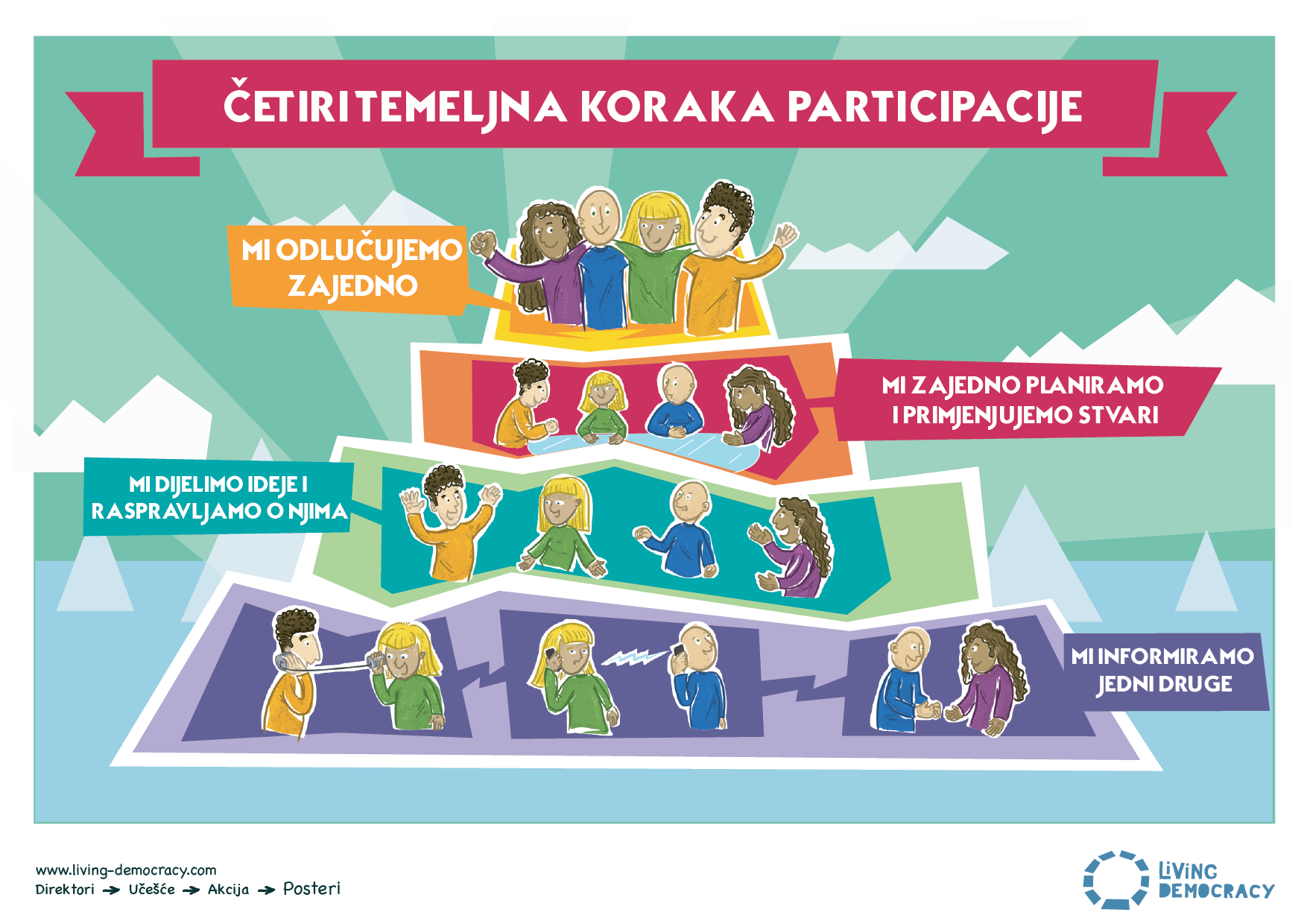 Living Democracy » Principals » SUDJELOVANJE » Akcija » Poster 1 – ČETIRI TEMELJNA KORAKA PARTICIPACIJE