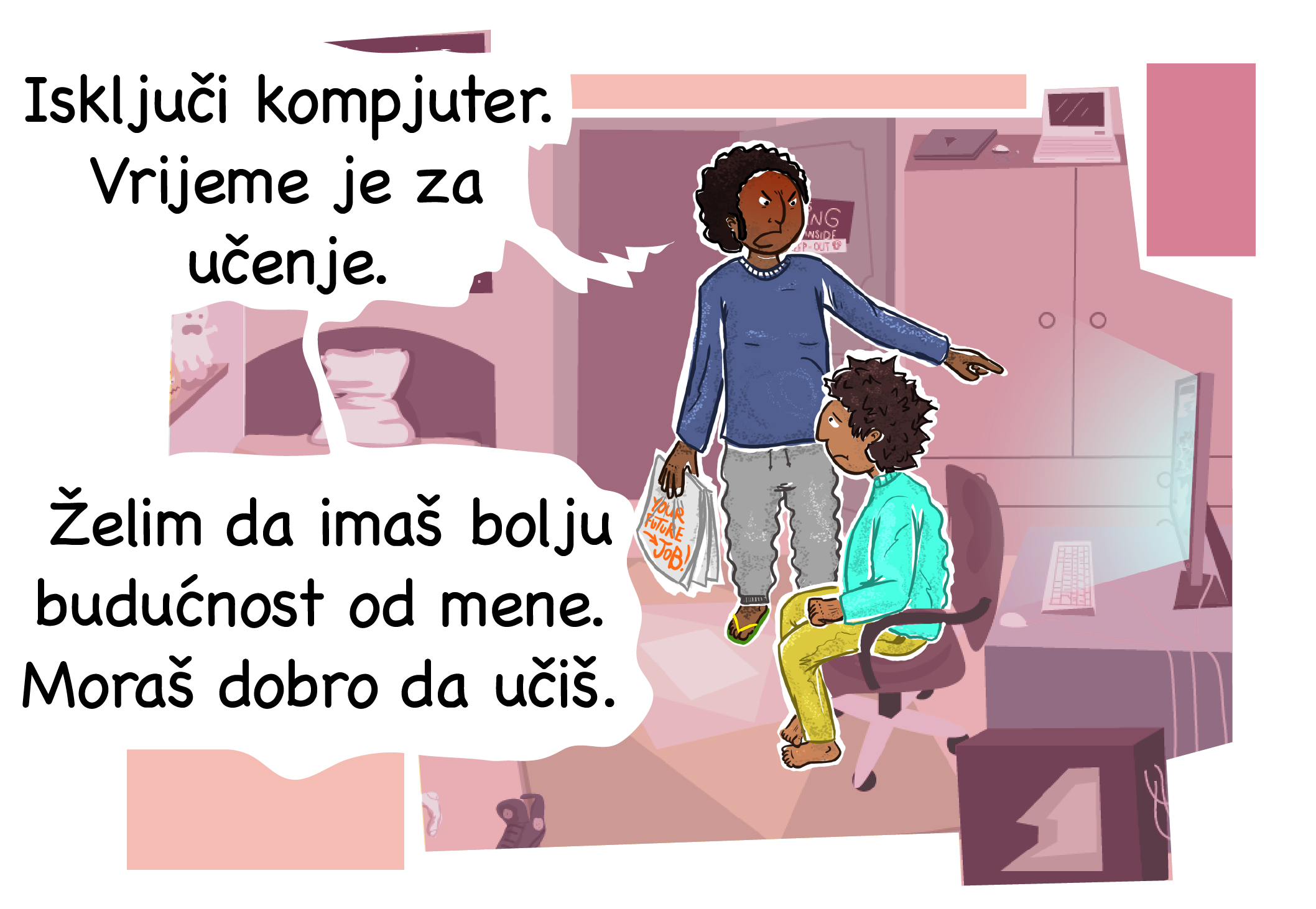 Međutim, prijetnje i pokroviteljsko ponašanje vjerovatno ne mogu pomoći da se Džejdon ubijedi da je potrebno da završi školu sa dobrim ocjenama. Zato je važno uspostaviti i održavati dobru klimu za razgovor. To, takođe, pruža vašem sinu priliku da praktikuje svoju demokratsku kompetentnost. Pri tome se morate suzdržati od, takozvanih, destruktivnih poruka. Za savjete i odgovarajuće sugestije kliknite ovdje.