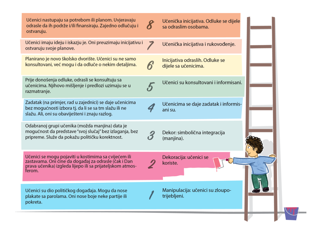 Living Democracy » Principals » PARTICIPACIJA » SVJESNOST » Ljestvice participacije: Pokušavamo da budemo iskreni!Sociolog Roger Hart napisao je knjigu pod nazivom Dječja participacija: teorija i praksa uključivanja mladih građana u razvoj zajednice i brige o životnoj sredini za UNICEF 1997. Ovaj pristup stavio je mlade i odrasle saveznike širom svijeta u kontekst globalnog pokreta za aktivnu participaciju. Nudi vama, vašim nastavnicima i roditeljima nevjerovatnu mogućnost: da budete iskreni prema tome kako integrišete djecu i mlade u procese donošenja odluka. Prečesto se djeca na javnoj sceni, tokom sastanka u nekom događaju, pa čak i u pozorišnoj predstavi, tretiraju kao puki ukras, ili su manjine simbolično integrisane kako bismo se bolje osjećali (http://www.freechild.org/ladder.htm)