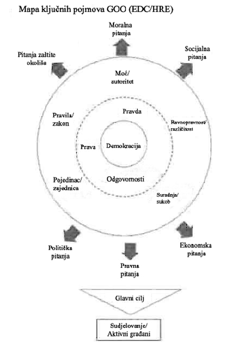 Demokratija je središte karte, što ilustruje kako je taj pojam prisutan u svakom kontekstu obrazovanja za demokratiju i ljudska prava. Participacija aktivnih građana u demokratskom društvu glavni je cilj obrazovanja za demokratiju i ljudska prava, a to se pokazuje centralnim položajem ovog pojma.