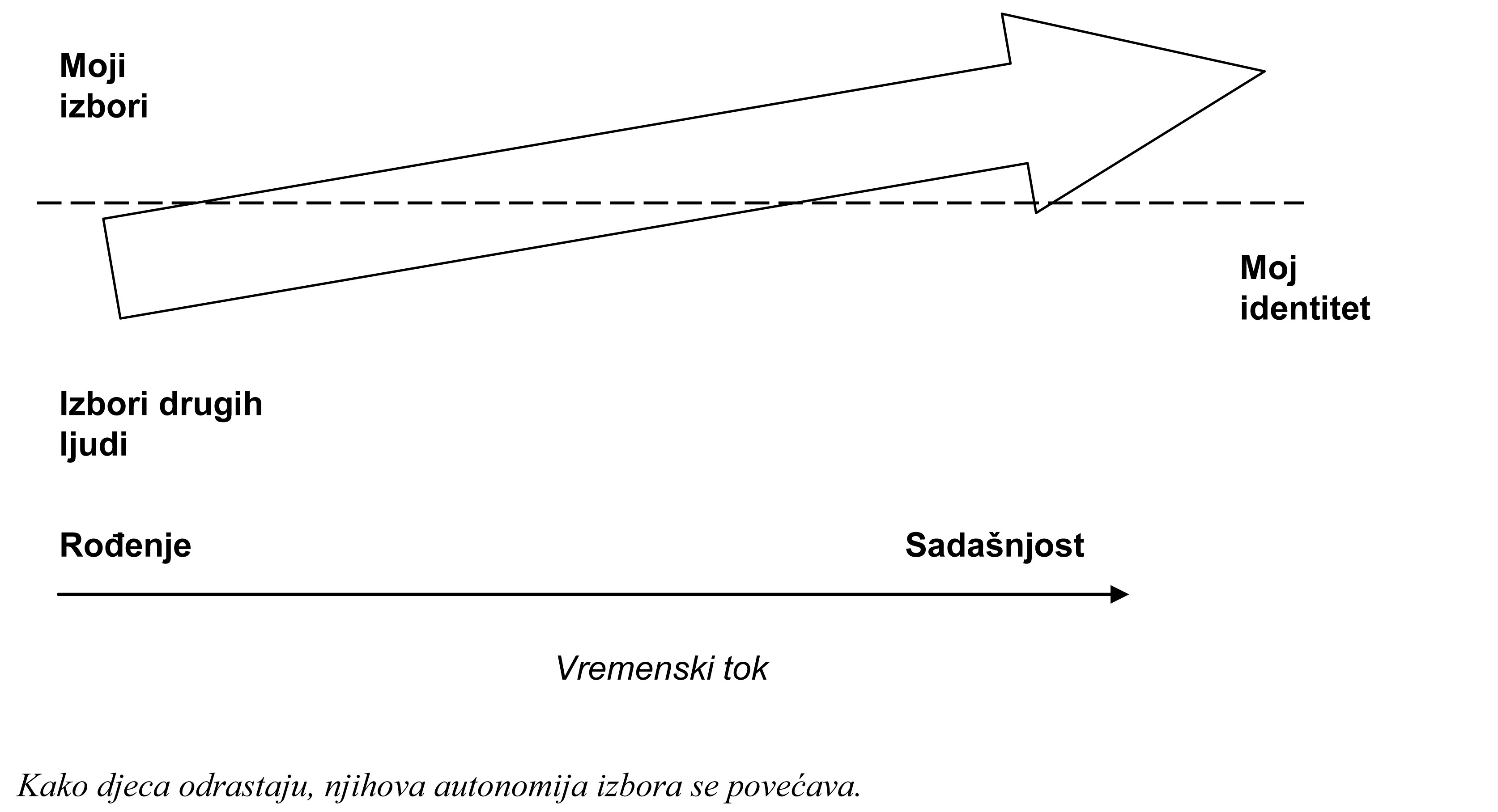 Adolescencija – povećana autonomija: u ranom djetinstvu drugi vrše izbor (roditelji, porodica, učitelji, ljekari). Kako odrastamo tako sve više izbora i odluka donosimo sami. Prema tome, na flip chart-u vjerovatno ćemo imati skupove koje možemo označiti simbolom strelice s vrškom okrenutim prema gore – pomak prema većoj autonomiji i ličnoj odgovornosti kako postajemo stariji. Jedan učenik može na papiru nacrtati strelicu (vidi prikaz u nastavku).