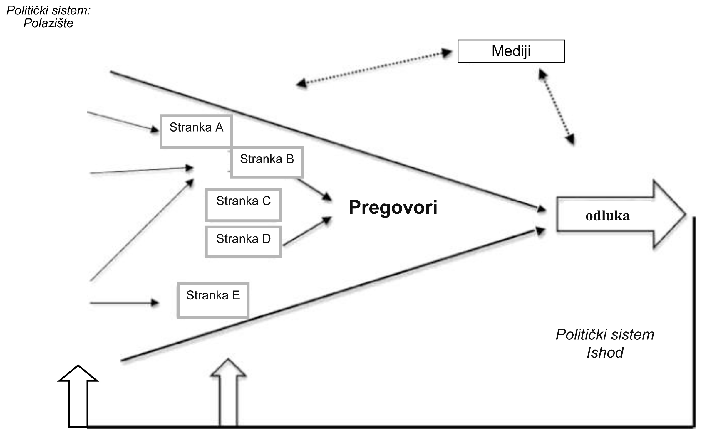 | Pojedinci aritkulišu vrlo različite ciljeve i interese | Posredovanje u ostvarivanju interesa principom zastupanja (stranke, lobiji ili NVO ili direktno (referendum). | Ishod je politička odluka koja utiče na članove društva. Njihova reakcija vodi do novih polazišta |