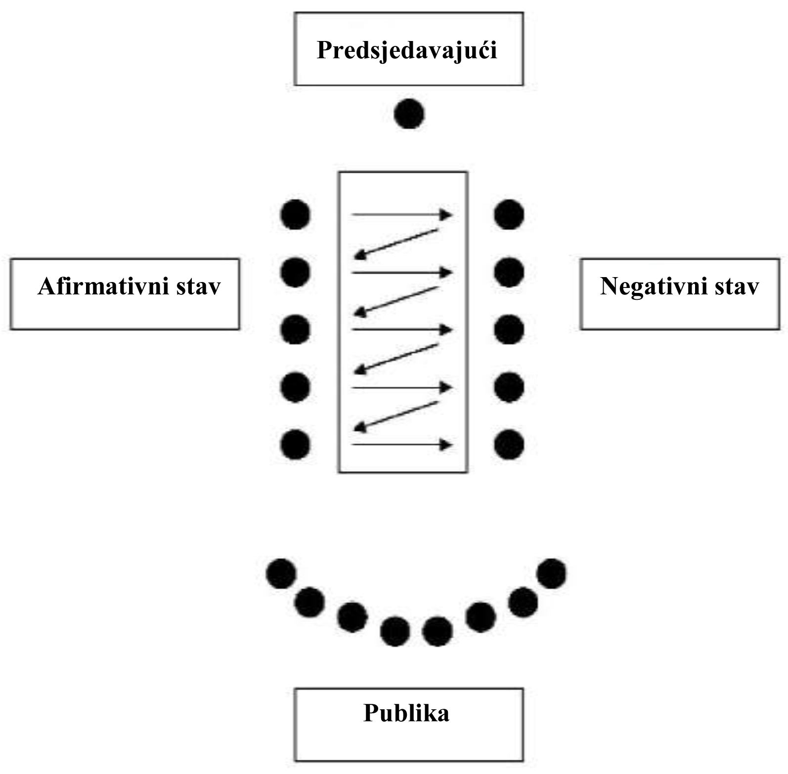 Predsjedavajući sjedi za čelnim stolom. Dvije strane koje učestvuju u raspravi sjede jedna nasuprot drugoj. Publika sjedi na izvjesnoj udaljenosti od stola, ali tako da može vidjeti obje strane. Ako je potrebno, dodatne stolice za publiku treba složiti u nekoliko redova, ali ne iza jedne od strana koje učestvuju u raspravi.