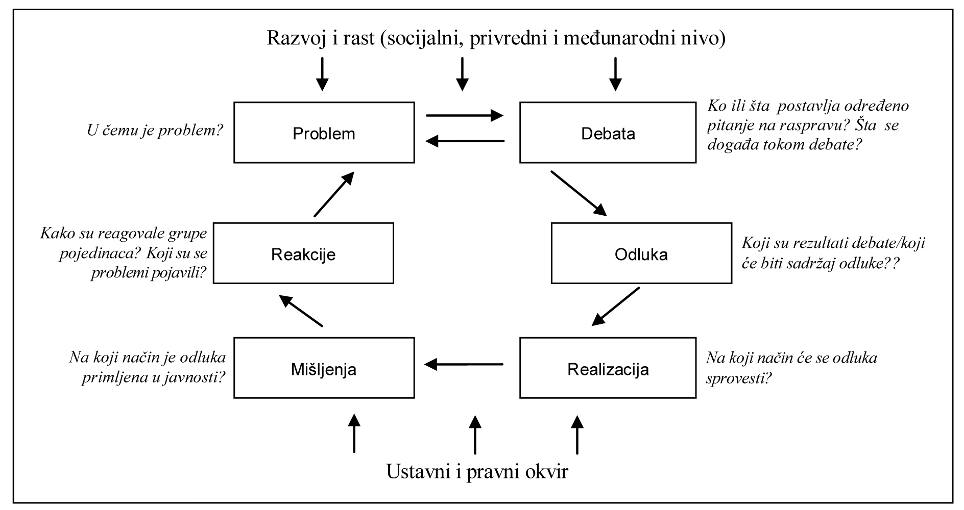 Debata se odvija pod određenim uslovima. Ovdje je važan okvir modela: socijalni, privredni i međunarodni tokovi obezbjeđuju informacije za raspravu, dok ustavni i zakonodavni okvir određuju pravila. Ko može učestvovati u debati? Ko o čemu odlučuje? Ova pitanja pomažu da razumijemo ishode debate, konačnu odluku. Ko učestvuje u debati? Koji su interesi u igri? O čemu treba da se pregovara? Je li moguće doći do kompromisa?