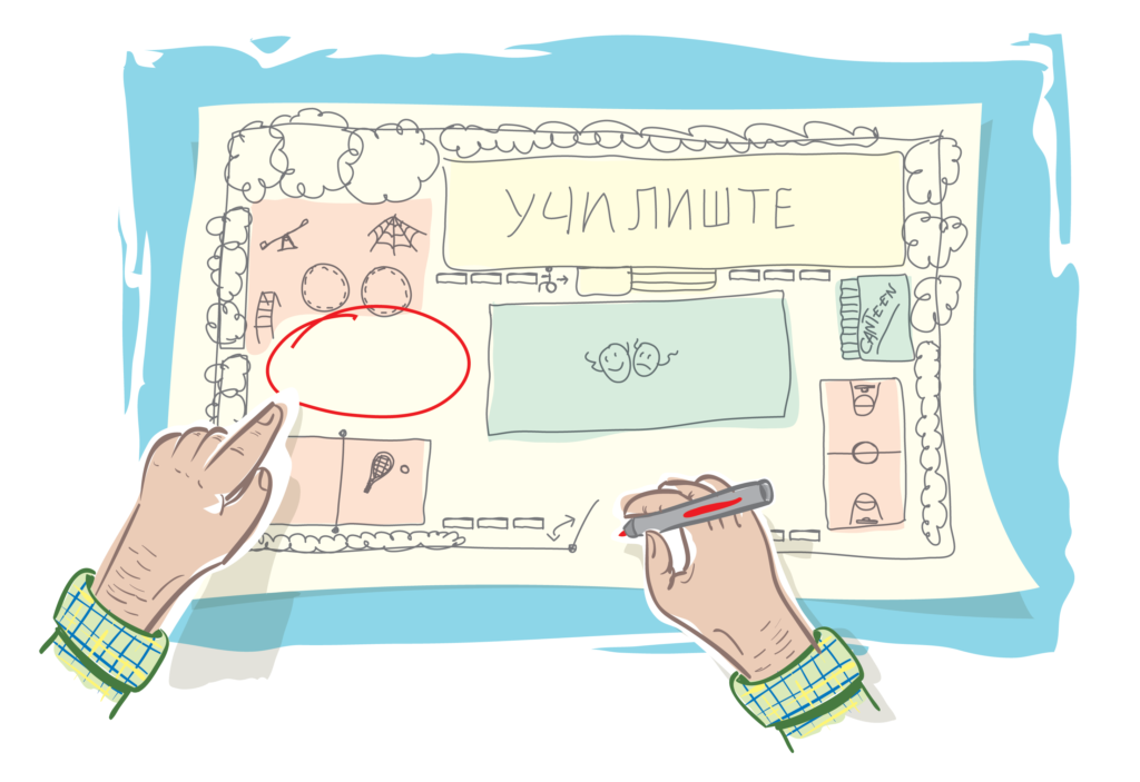 Living Democracy » Principals » АКТИВНО УЧИЛИШТЕ » ПОДГОТОВКА » Станување свесен за потенцијалот на моето училиште како место за „живеење и активно здравје“.Прво, подготвувате цртеж на училиштето со сите надворешни места, вклучувајќи растенија, скали, sидови, покриени места итн. според начинот на кој сега изгледа вашето училиште. Потоа, разгледајте го следново: