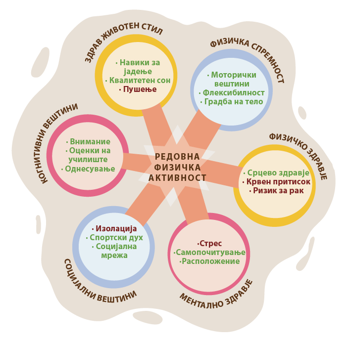 Како што е илустрирано погоре, редовната физичка активност директно влијае врз физичката и менталната подготвеност на човекот и социјалните и когнитивните вештини.