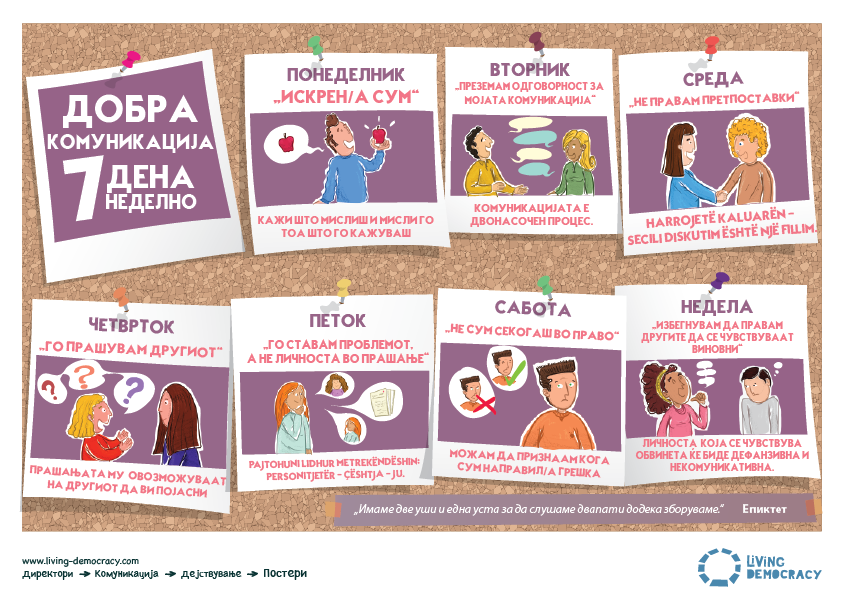 Living Democracy » Principals » КОМУНИКАЦИЈА » Делување » ПОСТЕР 1 – ДОБРА КОМУНИКАЦИЈА – 7 ДЕНА НЕДЕЛНО