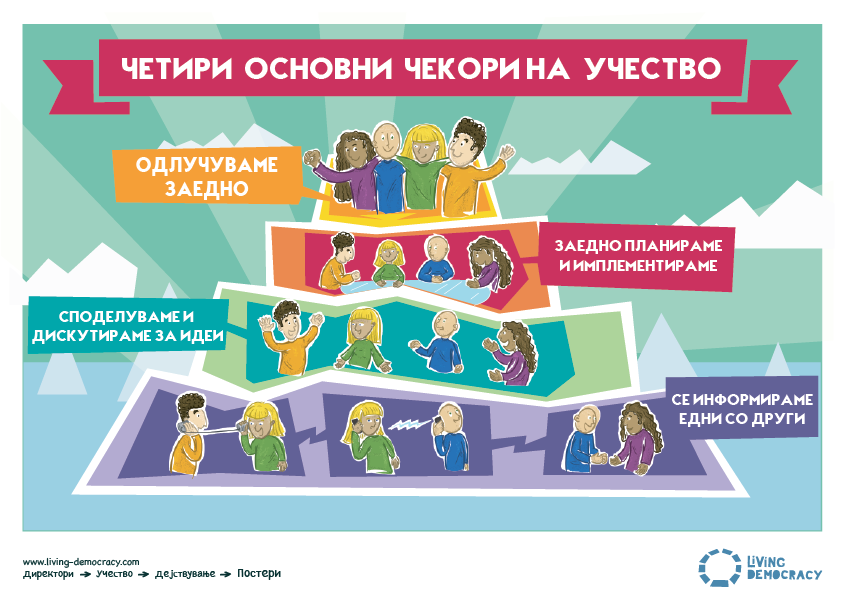Living Democracy » Principals » УЧЕСТВО » Делување » ПОСТЕР 1 – ЧЕТИРИ ОСНОВНИ ЧЕКОРИ НА УЧЕСТВО