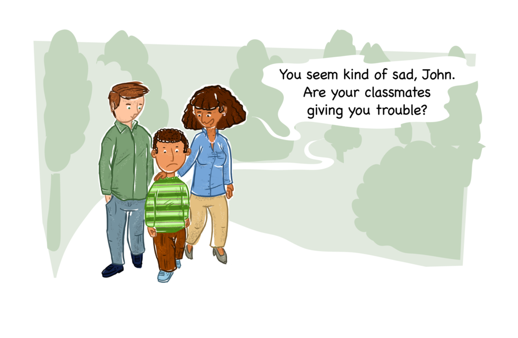 If John opens up and wants to talk with you, be careful to avoid recriminations. Statements such as “Why didn’t you tell me earlier? Why didn’t you tell the teacher?” can seem like an interrogation and easily evoke feelings of guilt, shame and anger.