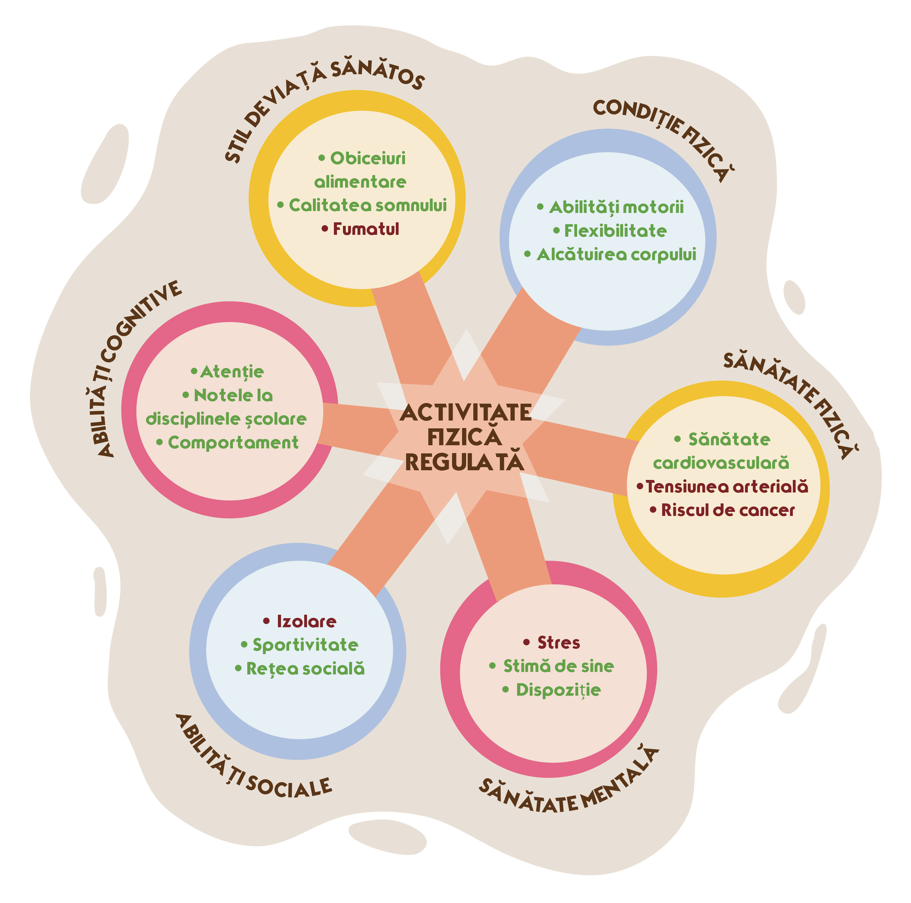 După cum se ilustrează mai sus, activitatea fizică periodică are un impact direct asupra condiției fizice și mentale a unei persoane și a abilităților sale sociale și cognitive.