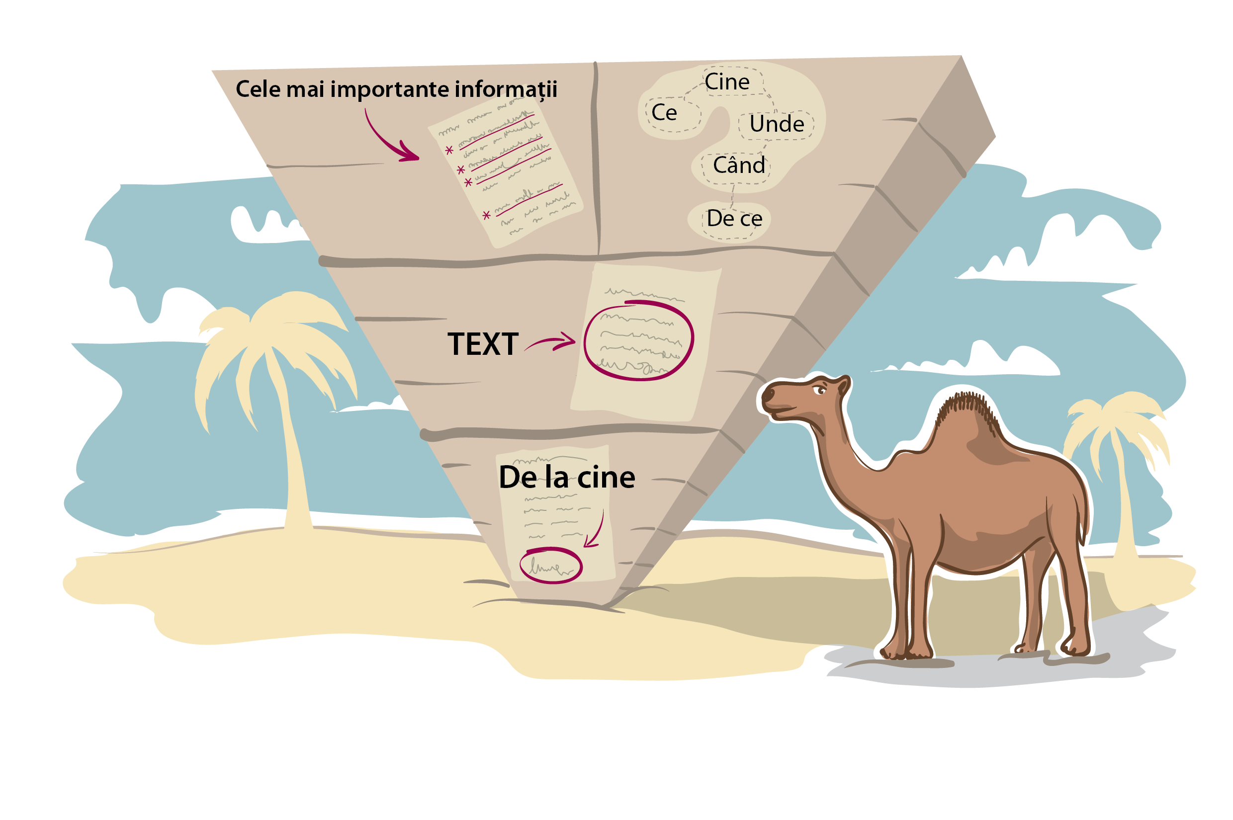 Înainte de a se publica un articol trimis unui ziar, acesta poate fi editat pentru a elimina exprimările prea lungi, iar anumite informații pot fi scurtate, mai ales spre sfârșitul textului. Prin urmare, scrierea unui comunicat adresat mass-mediei necesită o abordare deductivă, astfel încât informațiile importante să fie prezentate la început. Această procedură este cunoscută drept „piramida inversată”. Partea principală se află în centrul mesajului: trebuie să fie succintă, răspunzând totuși la cele cinci întrebări „W” + Cum (who – cine, what – ce, why – de ce, how – cum, when – când, where – unde).