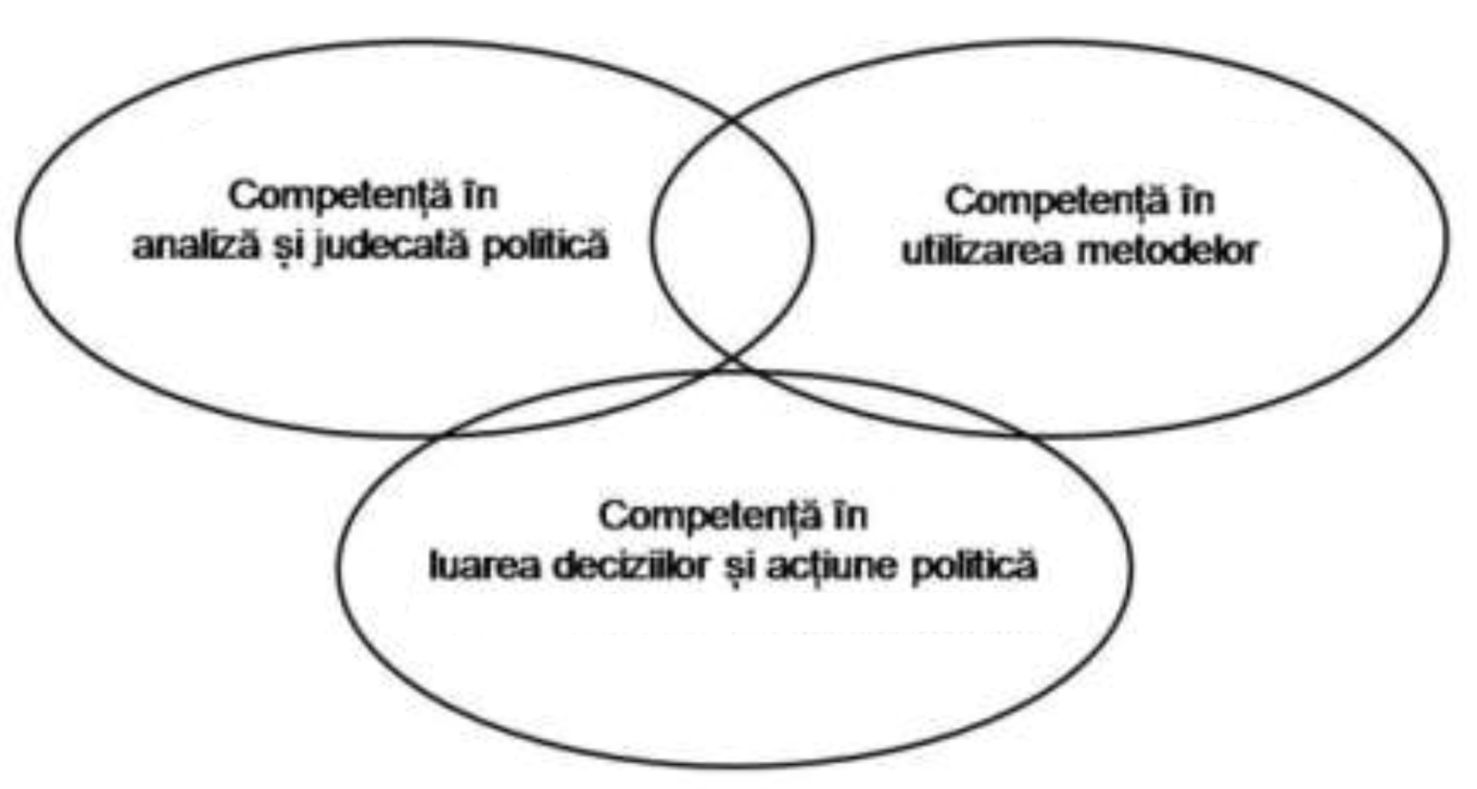 - abilitatea de a înțelege și de a aplica modelul tridimensional al politicii: a) instituțional, b) axat pe conținut și c) orientat pe proces;