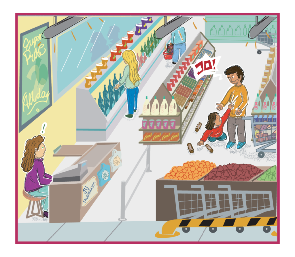 Ju jeni duke bërë pazarin me vajzën tuaj 2-vjeçare Celinën, e cila zbulon shumë gjëra interesante si: çokollata, tasa plastike dhe revista. Ajo dëshiron që ju t’i vendosni këta artikuj në karrocë dhe t’i blini. Por ju nuk keni nevojë për këto produkte dhe i thoni asaj që t’i lë ato. Celina pastaj dëshiron që t’i blini tri kuti të biskotave të saja të preferuara. Ju i thoni asaj: “Jo Celina, ne kemi ca nga këto biskota në shtëpi tashmë. Të lutem, vendosi ato përsëri në raft!”. Por Celina nuk bindet dhe këmbëngul që t’ia blini këto biskota. Ajo fillon të nxjerrë një zemërim dhe nuk duket se do të qetësohet së shpejti.