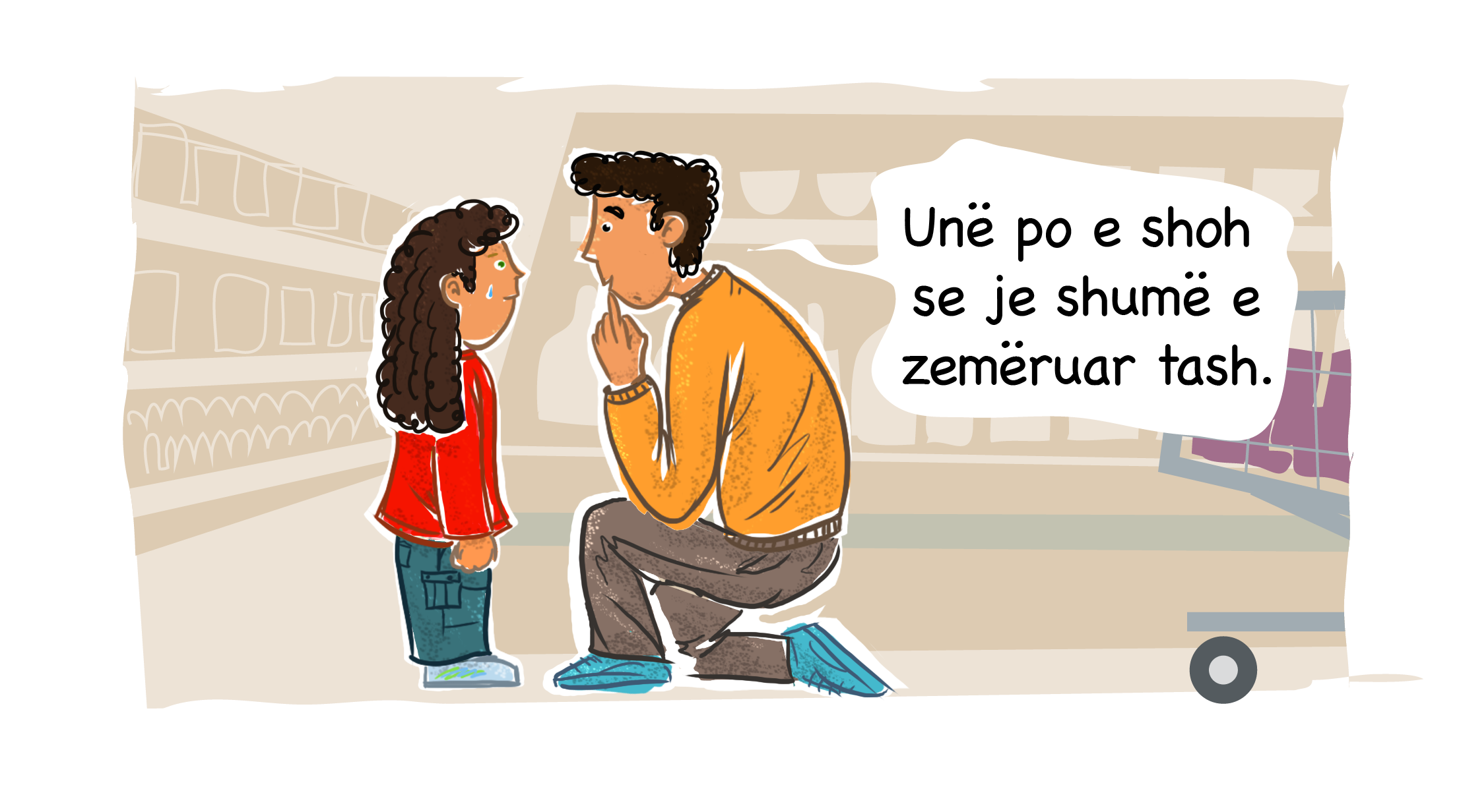“Mmmm, ke të drejtë: këto biskota janë të shijshme. Edhe unë i dua. Por ne i kemi blerë 3 pako të tilla herën e fundit që bëmë pazar. A e mban mend? Pra, ne nuk kemi nevojë të blejmë më biskota sot. Përndryshe, ato që i kemi në shtëpi do të mbeten të ndenjura. Të lutem, më ndihmo t’i kthej këto pako në raft dhe pastaj të shkojmë tek arka. Ndoshta do t’i hamë disa nga biskotat e tua kur të kthehemi në shtëpi.”