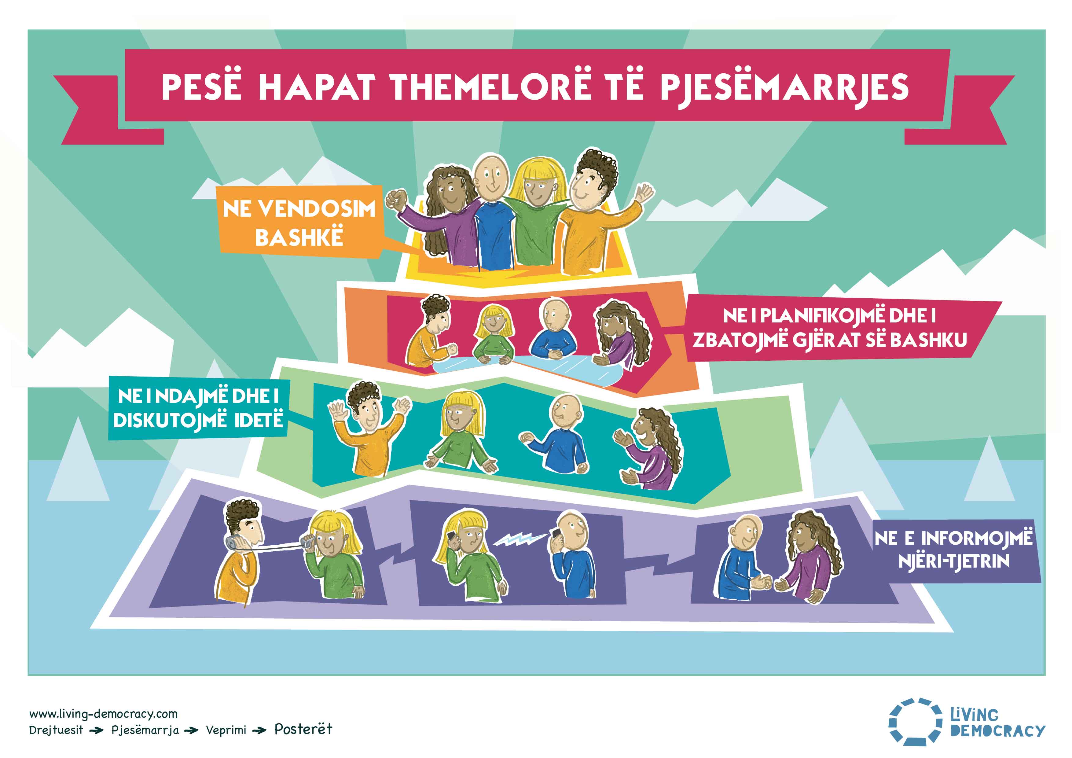 Living Democracy » Principals » PJESËMARRJA » Veprimi » Afishe 1 – Pësë hapat themelorë të pjesëmarrjes