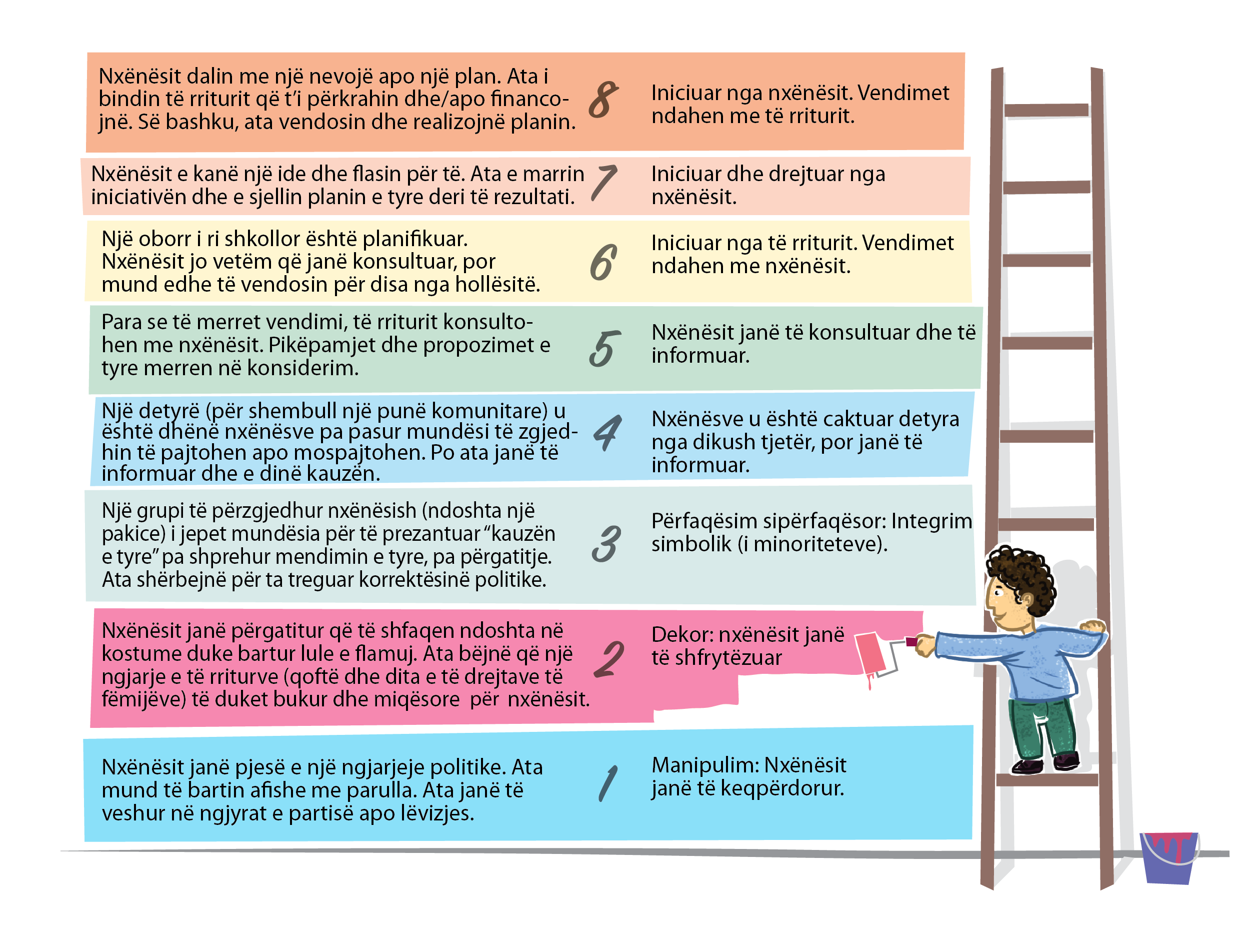 Living Democracy » Principals » PJESËMARRJA » Ndërgjegjësimi » Shkallët e pjesëmarrjes: Të munduarit për të qenë i sinqertë!Sociologu Roger Hart shkroi një libër të quajtur Pjesëmarrja e fëmijëve: Teoria dhe praktika e përfshirjes së qytetarëve të rinj në zhvillimin e komunitetit dhe kujdesin mjedisor për UNICEF më 1997. Kjo qasje e vendosi punën e të rinjve dhe aleatëve të rritur në të gjithë botën në kontekstin e një lëvizjeje globale për pjesëmarrje. Ju ofron juve, mësuesve tuaj dhe prindërve një mundësi të mahnitshme: të jemi të sinqertë lidhur me mënyrën si i integrojmë fëmijët dhe të rinjtë në proceset e vendimmarrjes. Shumë shpesh, fëmijët në një skenë, gjatë një takimi në një ngjarje, dhe madje edhe në një shfaqje teatrale trajtohen si dekorim i thjeshtë, ose pakicat janë integruar si shenjë për të na bërë të ndihemi më mirë. (http://www.freechild.org/ladder.htm)