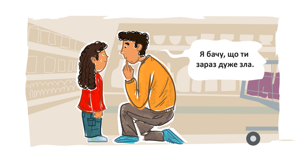 “Ммм, ти права: це печиво смачне. Я теж його люблю. Але ми купили 3 пачки в попереднього разу, коли разом з тобою ходили до магазину. Ти пам’ятаєш? Саме тому сьогодні нам не потрібно купувати це печиво знову. Інакше те, що у нас вдома, зіпсується. Будь ласка, допоможи мені покласти ці пачки назад на полицю, а потім ми підемо на касу. Ми спробуємо таке ж точно печиво вдома.