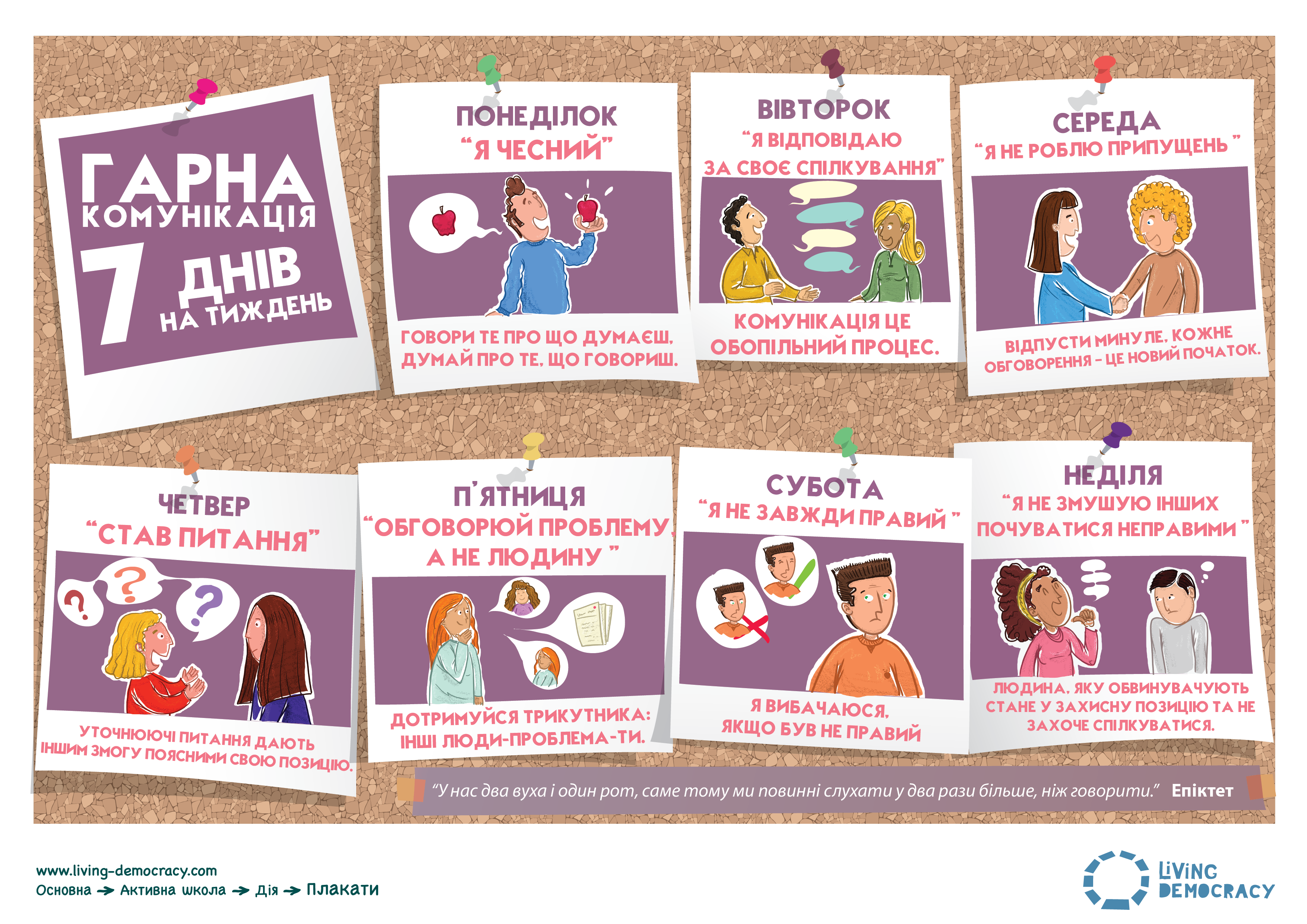 Living Democracy » Principals » КОМУНІКАЦІЯ » Дія » Плакат 1 – Плідне спілкування – 7 днів на тиждень