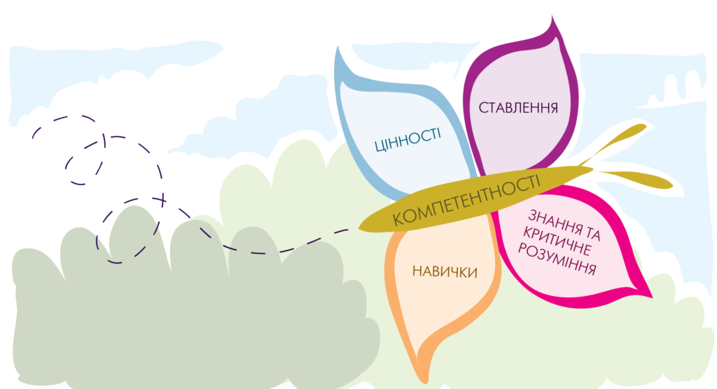 Модель компетентності Ради Європи – Компетентності для культури демократії – включає чотири аспекти – цінності, ставлення, навички, знання та розуміння.