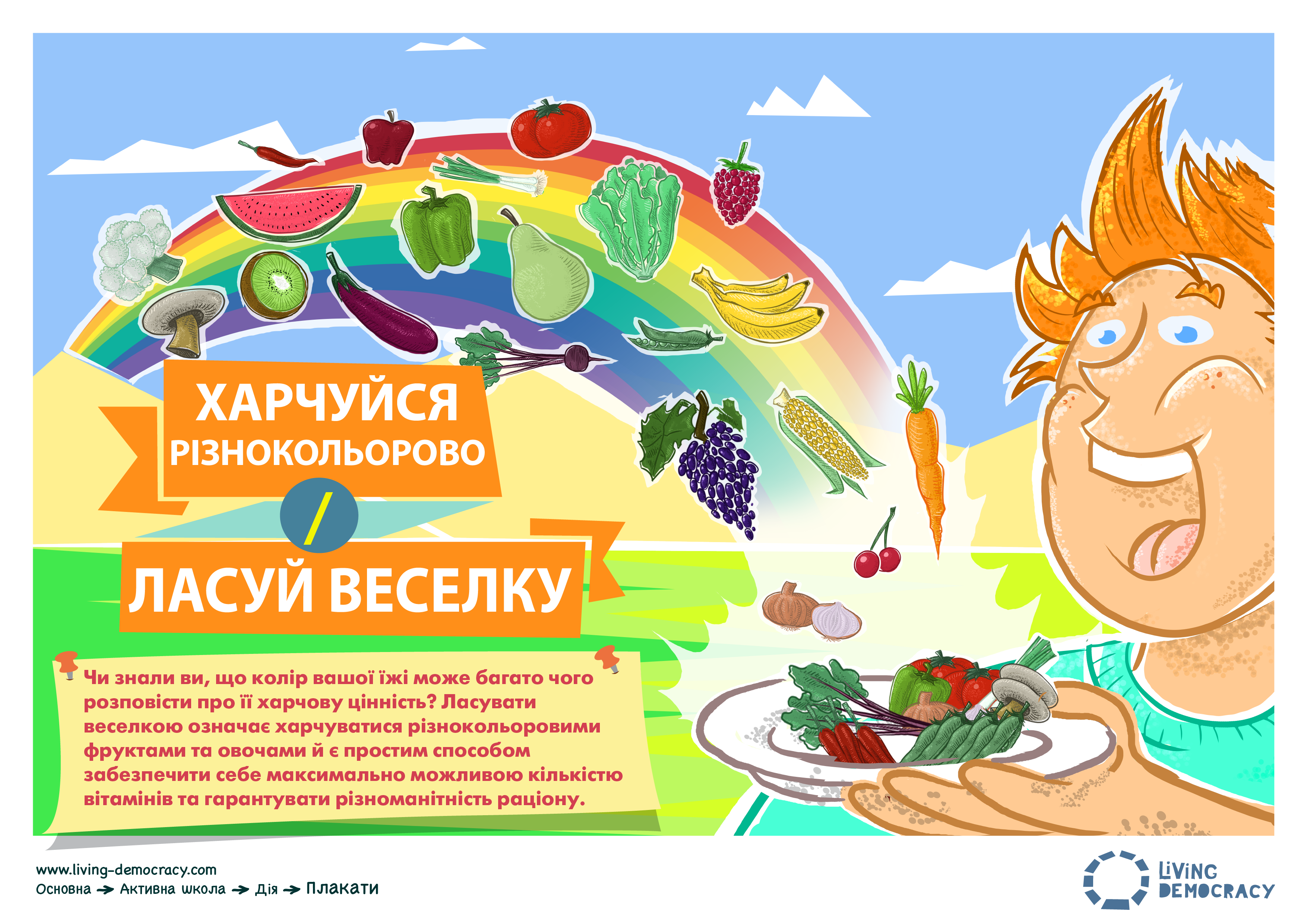 Living Democracy » Principals » ХАРЧУВАННЯ » Дія » Плакати 1 – Кольорове різноманіття їжі