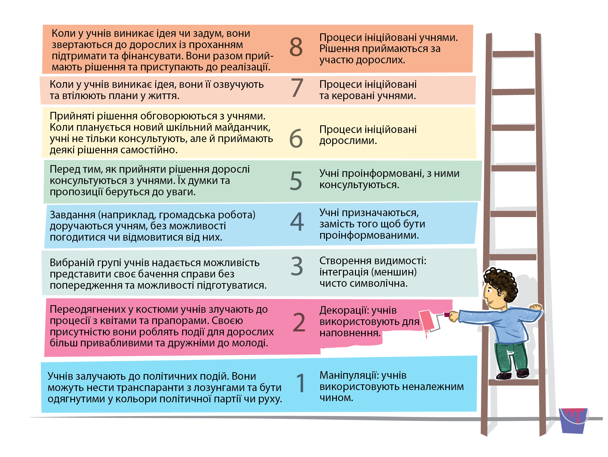 Living Democracy » Principals » ПОЛІТИКА ЗАЛУЧЕННЯ » Обізнаність » Сходи/етапи впровадження політики залучення: Намагайтеся бути чесними!Соціолог Роджер Харт написав книгу під назвою «Залучення дітей: теорія та практика залучення молодих громадян до розвитку громади та догляду за навколишнім середовищем для ЮНІСЕФ у 1997 р.». Такий підхід ставить роботу молодих та дорослих однодумців по всьому світу в контекст глобального руху щодо залучення у процеси управляння. Це дає вам, вашим учителям і батькам дивовижну можливість: чесно говорити про те, як ми інтегруємо дітей і молодь до процесів прийняття рішень. Занадто часто до дітей на сцені, під час зустрічей, в тому чи іншому заході (і навіть у театральних постановках) відносяться просто як до декорацій, а меншини об’єднуються чисто номінально. Це допомагає нам відчути себе краще, але не більше. (http://www.freechild.org/ladder.htm)